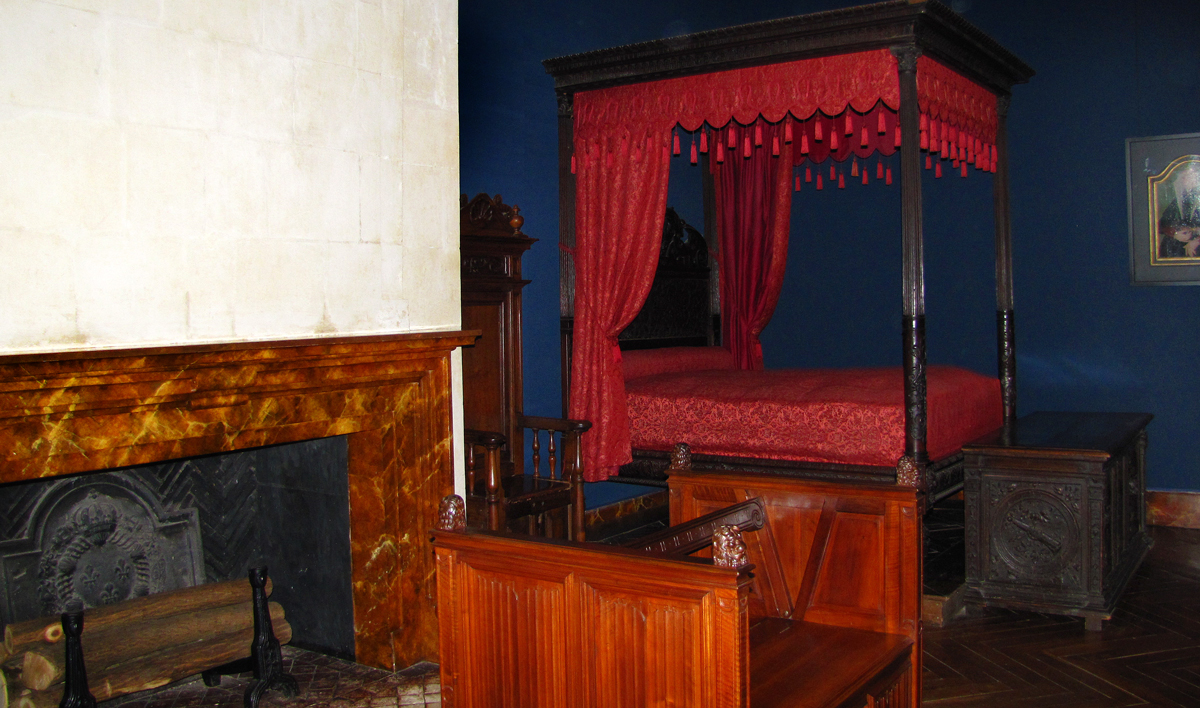 După ce ne-a luat frigul bine de tot, am intrat înăuntru. Interiorul este destul de interesant, cu încăperi mari și elegante, saloane și apartamente bogat decorate. Camerele sunt aranjate în stil renascentist italian, cu elemente sculptate și tapițerii vechi. Mobilierul este interesant, cu baldachine de stejar, piesele fiind lucrate în lemn masiv, iar pereții sunt ornați cu tablouri și alte obiecte de artă. Lumina difuză, mirosul de lemn ars din șemineele imense care funcționează încă, și muzica relaxantă, în surdină, care te însoțește pas cu pas, te duc parcă într-o altă lume. De la ferestre se poate admira râul care înconjoară castelul, așa că priveliștea este fermecătoare.