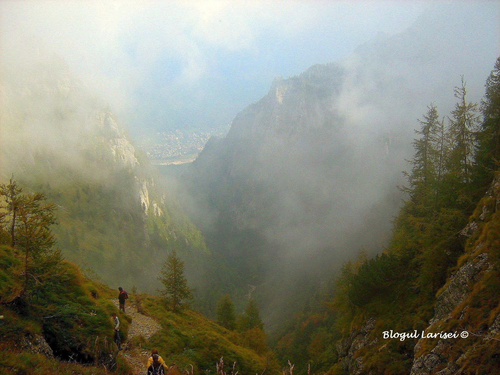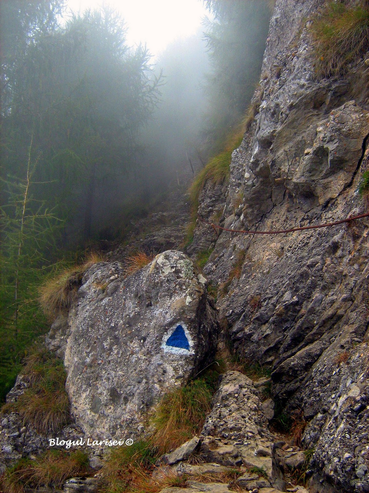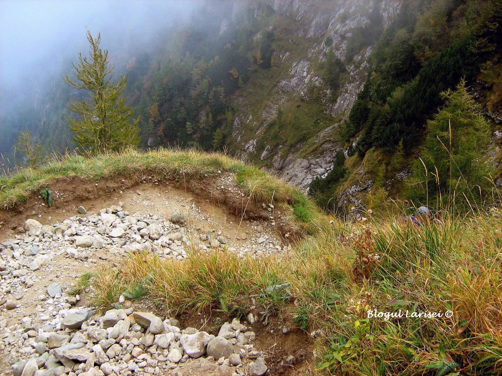 Ceva mai plictisitor, in mare parte, drumul serpuieste prin padure, traverseaza vale dupa vale, versant dupa versant, pana ajunge aproape de limita superioara a padurii, intr-o rariste de molid, in punctul „La Mese”. De aici incepe partea interesanta a traseului, asa cum imi place mie! Abia aici vedem „frumusetea”. Poteca de aici este sapata in stanca, urcand in serpentinne printr-o rariste de larice, un arbore deosebit de frumos si de verde.