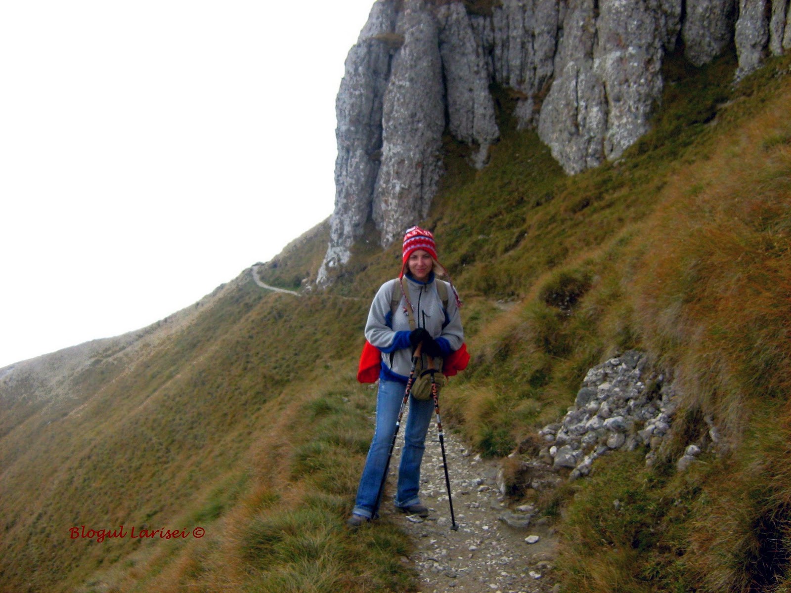 Continuam sa coboram pe serpentine sapate in stanca, mai traversam un valcel stancos si ajungem la scara din piatra. Alte serpentine dupa care traversam valea pe versantul opus, mai faem o poza doua, mai ne plangem de picioare, mai intram in alt horn, mai coboram niste stanci si uite asa ajungem…pe la jumatatea drumului :))! Ce credeati ca acasa? Nici gand!