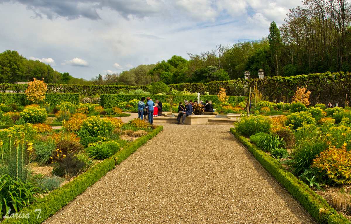 Animalele de companie sunt autorizate pe domeniul castelului, ba mai mult decât atât au șansa să-și facă și un prieten, și-anume pisica familiei Carvallo, vedeta grădinii. Chiar am zărit-o cum dormea tolănită la soare, culmea, chiar în grădina soarelui, ignorând total puzderia de vizitatori din jurul ei. Pentru că da, în duminica de Paște a fost puzderie de turiști la Villandry. Niciodată n-am văzut parcarea atât de neîncăpătoare, la fel cum niciodată nu-mi amintesc să fi stat la coadă pentru a cumpără biletele de intrare la vreun castel de aici. Cu toate acestea, grădina fiind mare, n-am simțit prea tare aglomerația, vizitatorii fiind dispersați pe un domeniul atât de vast.