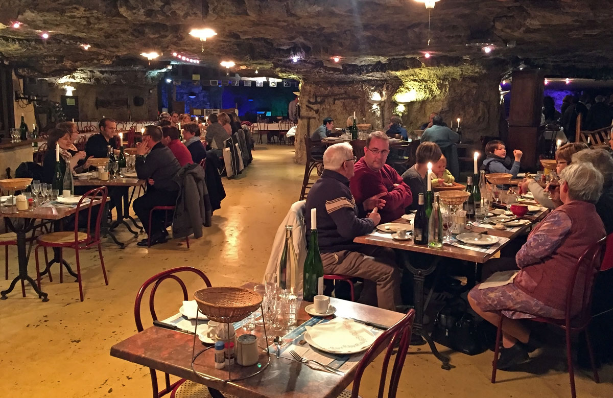 (476 Quai des Violettes), situat nu departe de centru, îți va oferi o masă tradițională, servita într-un cadru original, o imensă grotă trogloditică, săpată în faleza ce străjuieste malul stâng al Loarei. Nu te speria că-i o grotă, cavitatea este renovată, amenajată și foarte bine ventilată, iar interiorul este plăcut decorat, în stilul rustic, tradițional regiunii Touraine. Vedeta inconfundabilă este cuptorul pentru fouées, în care arde mereu focul și care răspândește o aroma plăcută. Les fouées, specialitătile culinare trogloditice, sunt niște pâinici rotunde coapte la foc de lemne chiar în fața clienților, care, odată scoase din cuptor, sunt servite imediat. Ele se taie pe mijloc și se tartinează cu diverse pateuri ca rillettes, mogettes, unt sărat sau brânză de capră. Meniul la Cave aux Fouées este unic și cuprinde: o băutură aperitiv (un kir de regulă, adică un cocteil făcut din vin spumant și lichior de coacăze), antreu (rillettes, pate regional și cremă de unt cu usturoi de întins pe painicile fierbinți servite alături de salată verde), fel principal (noi am avut un căprioară într-un sos de bere, acompaniată de cartofi gratinați la cuptor), brânză de capră (Saint-Maure-de-Touraine, specifică regiunii), desert (tartă cu mere), plus băuturile, adică vin și cafea. Apa și micile fouées sunt din partea casei.