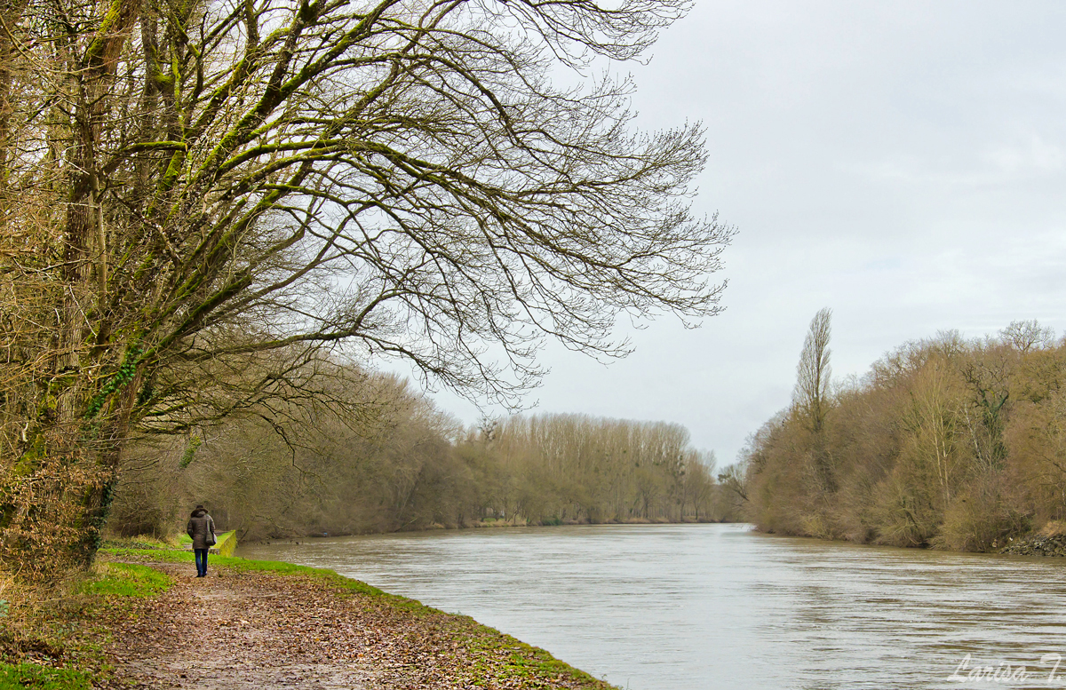 N-a durat mult plimbarea. Poteca mergea mai departe în lungul râului, dar cât să te duci, mai ales că Azorel avea plăcerea deosebită să meargă fix pe malul apei. De frică să nu călcăm pe urmele Dianei de Poitiers și să nu plonjăm și noi iarnă în Cher, am făcut cale întoarsă la mașină, încheind astfel o altă plimbare reconfortantă de duminică. Recomand tuturor care ajung aici să-și rupă din timp și după vizitarea castelului să facă această scurtă plimbare prin pădure și prin cei 800 de ani de istorie de la Chenonceau. Vara sau într-o zi însorită de toamnă cred că e minunat. Nu se poate trece dincolo prin castel, deși există o ușă, ci trebuie ocolit prin localitate. Am atașat o hartă în caz că cineva, dintre cei care citesc, e interesat. Despre vizită mea din 2011 am povestit mai multe aici. Și chiar dacă am fost atunci, o să mai merg încă odată să-l vizitez pe de-a-ntregul, dar mai la vară, să fie cald, soare și grădinile înflorite. Credeți-mă pe cuvânt, de Chenonceau n-ai cum să te plictisești vreodată.