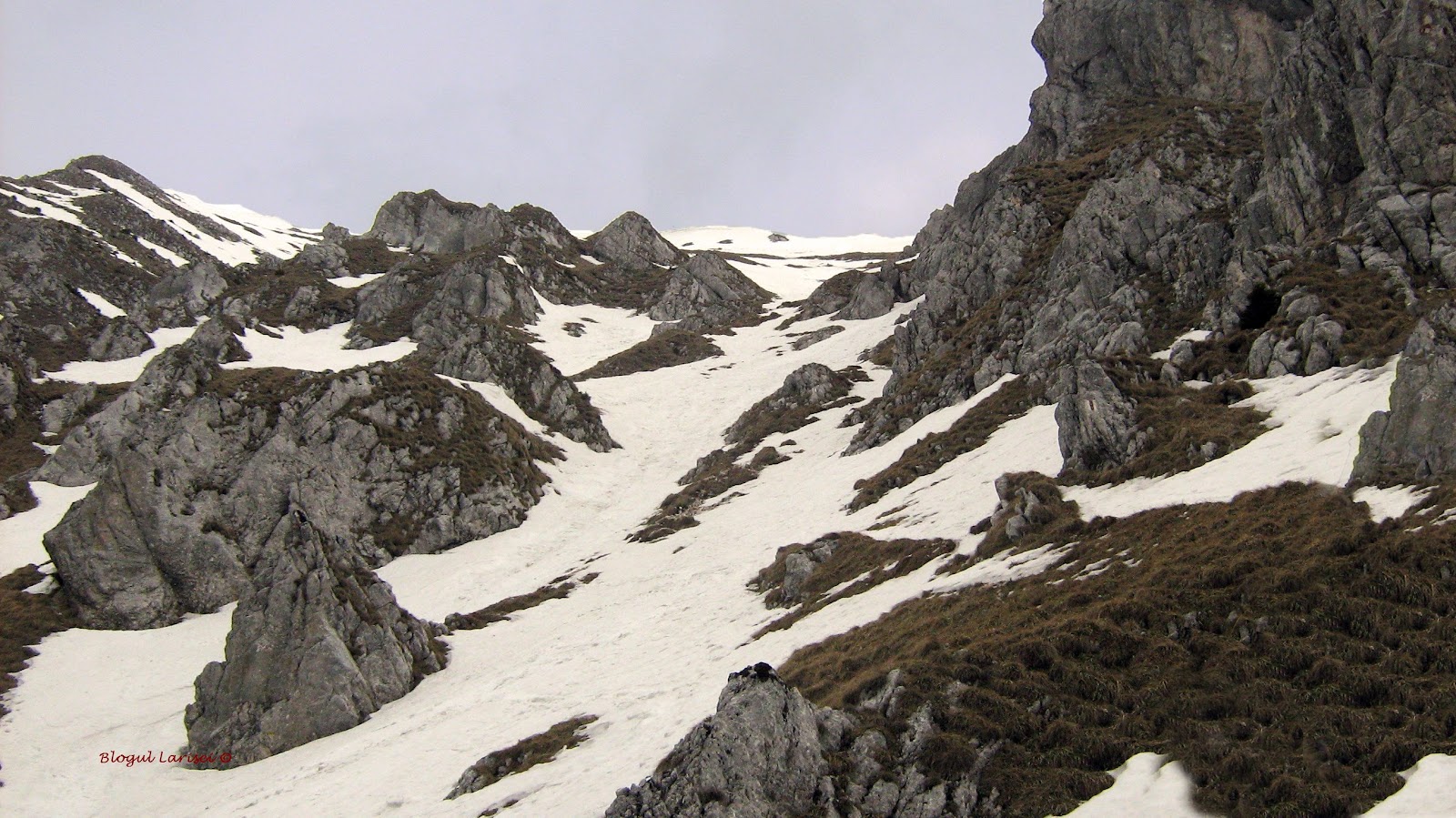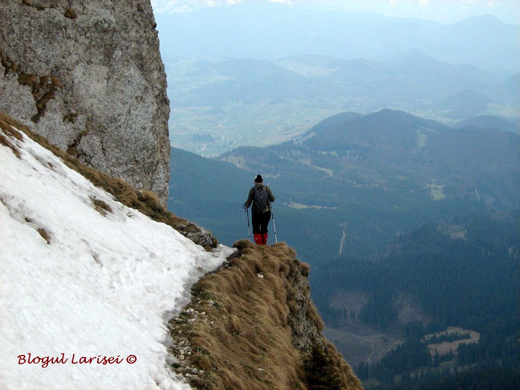 Grohotișul ca grohotișul, zăpada era problema. Cărarea aia îngustă, în stânga căreia era ditamai prăpastia, era jumate plină de zăpadă, întărită pe care se putea alunecă ușor. Dar până să o trecem, facem o altă mică pauză, că deja nu mai poate nici unul dintre noi. Pot să spun cu mâna pe inimă că eram varză deja! Jumătate din mine nu mai voia să urce mai departe, mai ales picioarele. Insă jumătate spunea Cum Larisa, ai ajuns până aici și nu mergi mai departe?! Ce înseamnă asta?! Asta este una din lecțiile de viață, care le-am învățat pe munte, printre multe altele: să nu renunți niciodată. Să mergi mai departe oricât de stors de puteri ești, pentru că sigur poți mai mult decât crezi!