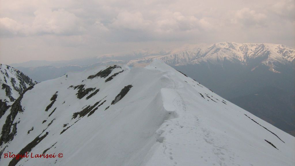Urcăm în serpentine scurte, cu atenție, să nu ne ducem la vale. Peretele de stâncă din față noastră se face din ce în ce mai mic, semn că ne apropiem de vârf. Mai pe traseul marcat, mai „pe arătură”, mai de-a dreptul, mergem și noi pe unde putem. Mai în două picioare, mai patru, mai de-a bușilea, că panta la fel de abruptă era, cărarea marcată era plină de zăpadă, deci nu putem merge pe ea. Admirăm în spate Culoarul Rucar-Bran și Bucegii, pentru cA într-un sfârșit poteca noastră să ia sfârșit în creasta principală, în apropierea Vârfului La Om. In sfarsiiiit!!!!