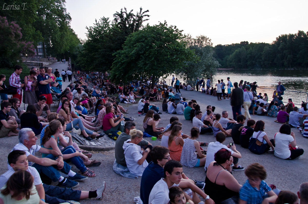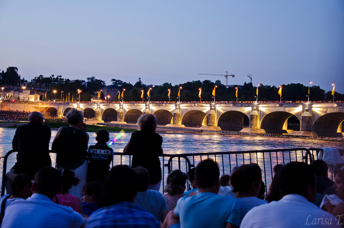Așa că pe la 9.30 am plecat spre malul Loarei cu toată gașca de familie și prieteni. Nu eram singurii, cred că toată populația orașului se îndrepta într-acolo. Ziceai că e manifestație, miting, adunare nu alta: localnici, turiști, copii, bătrâni, câini, pisici toți erau înșirați pe malul Loarei, pe cheiuri, pe docuri, pe poduri, sau sub poduri. Deși mai era 1 oră până începeau, cu greu am găsit un loc bun, să ne întindem păturica și trepiedul. Mai o glumă, mai o bere rece, mai o discutie antrenantă despre ce sărbătorim de fapt pe 14 iulie, nici nu ne-am dat seama că aproape nu mai era loc să arunci un ac în jurul nostru și nici că artificiile au început până la urmă pe la 11.30. Dar a meritat așteptarea. Spectacolul fu tare fain. Nu pot spune că a fost extraordinar, pentru că am văzut spectacole mult mai faine în București de Ziua Națională, dar este de înțeles. Până la urmă Tours este un oraș mic de provincie, nu capitală. Sunt convinsă că la Paris sunt mai spectaculoase, dar sinceră să fiu, n-aș vrea să încerc îmbulzeala de acolo. Nici măcar într-o zi ca 14 iulie. N-au durat decât vreo juma’ de oră, după care am pornit spre casă. Nu mi-au ieșit cine știe ce poze, că a fost prima dată când fotografiam artificii, chiar prima și ultima data când încerc. Prefer să mă bucur de ele cu ochiul liber, nu prin obiectiv.