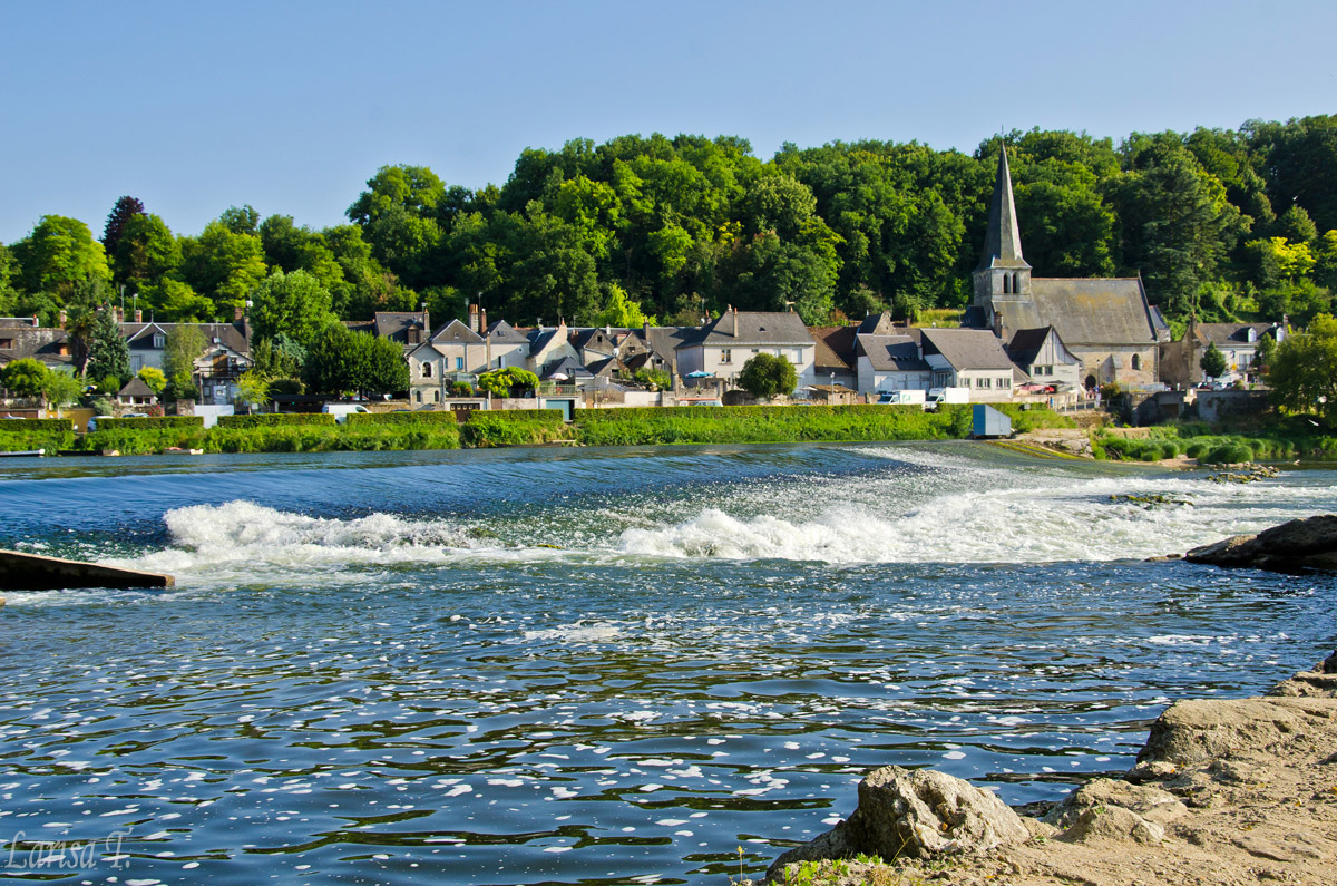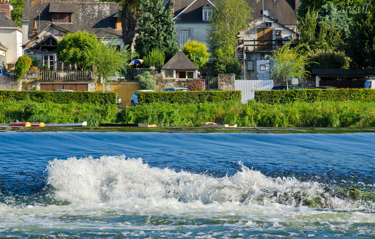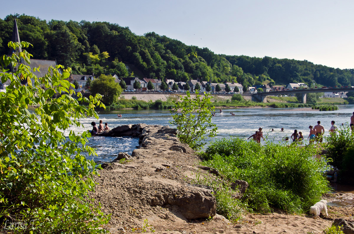 Ne-am început oricum ziua de duminică pe la prânz (v-ați prins, noi sărbătoriserăm și cu o seară înainte!) cu un grătar la un amic care locuiește la curte. Fripturică, vinișor, brânzică împuțită; cum altfel ar fi putut fi o masă de Ziua Națională a Franței?! După-amiaza a continuat cu puțină relaxare la umbră, că oricum altceva nu se putea face, ținând cont de cele peste 30 de grade din termometre. Cum piscina amicului nu era funcțională și noi simțeam nevoia acută de bălăceală, când soarele a mai coborât un pic, am luat-o și noi din loc spre Savonnières, o localitate la vreo 20 km de Tours, unde este o plajă foarte drăguță pe malul râului Cher. Nu cred că locul este creat de natură, ci mai degrabă de om, cu nisip artificial, dar este perfect când nu ai mare în apropiere. Apa era numai bună de baie, așa că până târziu nu ne-am mișcat de acolo. Până și Azorel a înotat de bunăvoie și nesilit de nimeni, atât de cald era. Dar a trebuit să ne mișcăm, pentru că la 22.30 erau programate focurile de artificii în Tours.