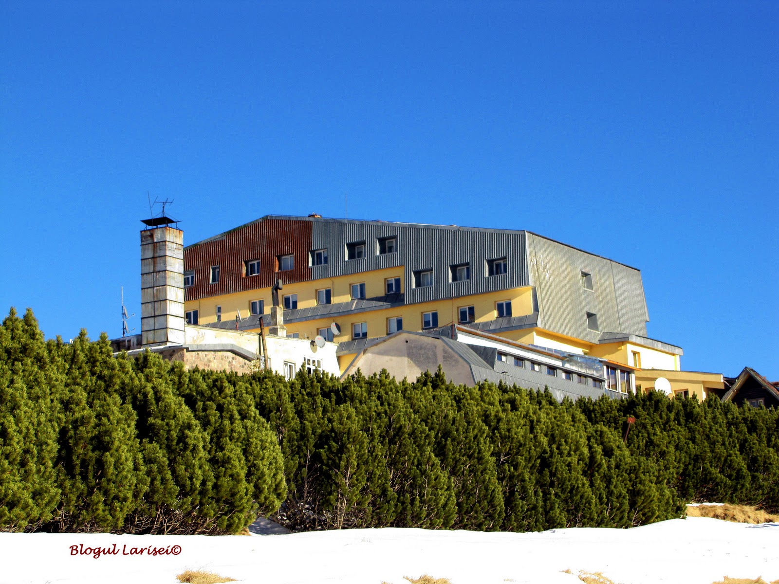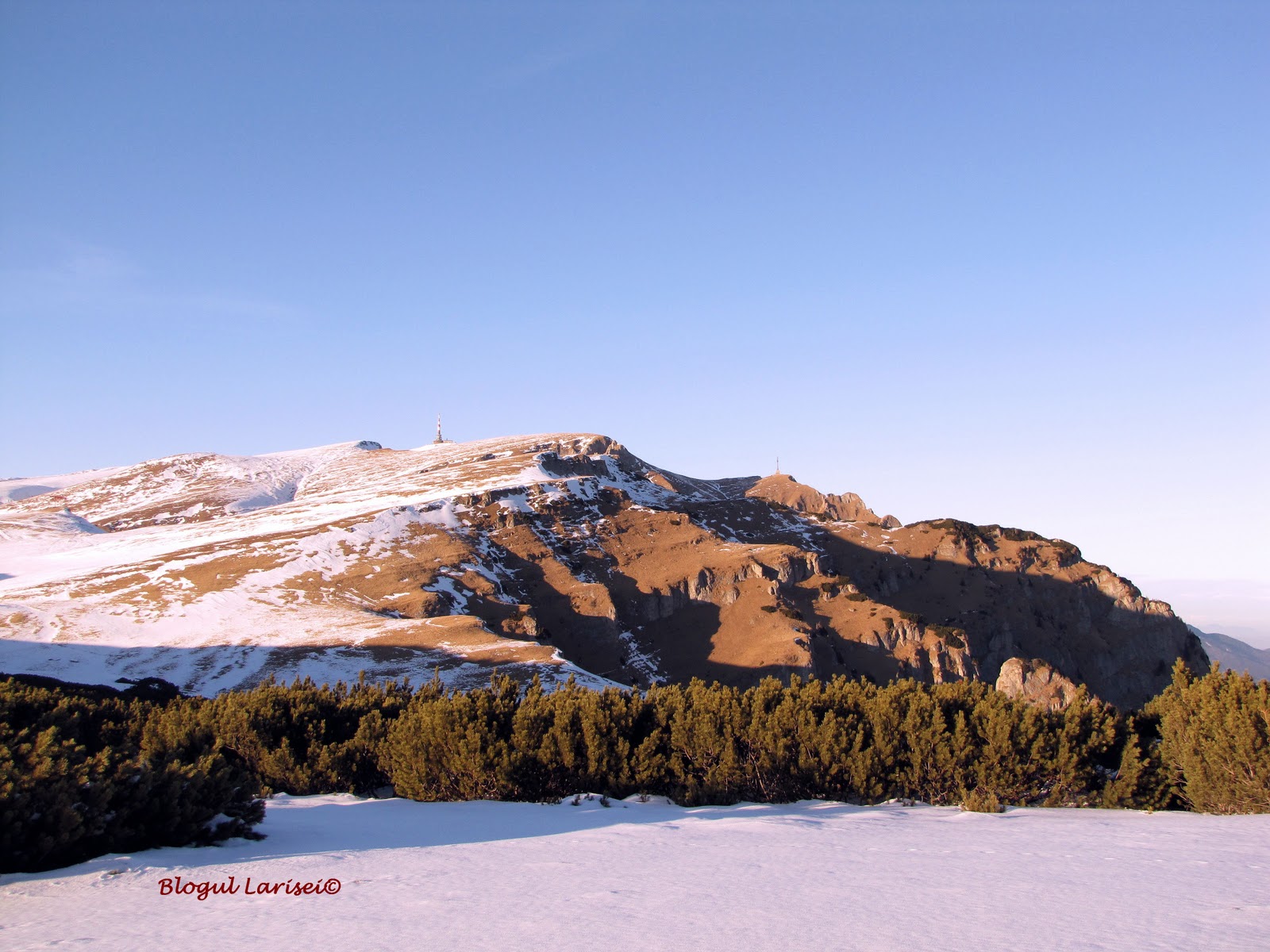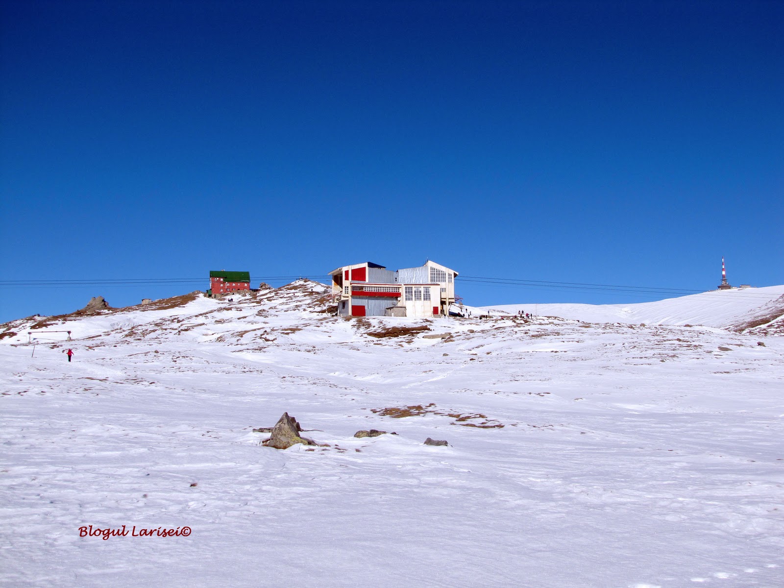 La telecabină cam aglomerat și un preț destul de piperat, dar, deh, sănătatea și viața sunt mai importante. După cam o oră de așteptat la coadă, urcăm și noi, telecabina se urnește plină de turiști, majoritatea care nu aveau treabă cu drumețiile și în câteva minute suntem pe platoul Bucegilor. Nu era prea mare agoleratie acolo sus, spre surprinderea mea, poate și pentru că la ora aia majoritatea abia se trezeau. Zăpada era puțină, Caraimanul se vedea în zare golaș, ca într-o toamnă târzie. Nici urmă de vânt, doar un cer senin ca de sticlă și un soare care parcă îngheța tot peisajul din jur. Un adevărat deșert de gheață!