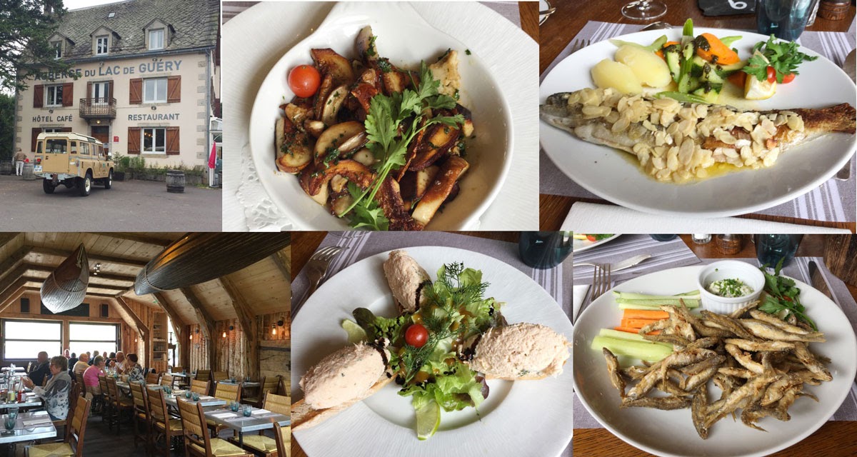 Pe malul lacului este amplasat L’Auberge du Lac de Guéry, un vechi hotel familial, a cărui istorie coboară până în secolul XVIII, pe când era doar o casă pentru întreținerea lacului. Integrat armonios în peisajul ce îl înconjoară, hotelul se poate dovedi un popas interesant nu departe de stațiunea Mont Dore, pentru cine dorește un sejur liniștit, în mijlocul naturii. Mie una mi-a plăcut foarte tare, poate data viitoare ne rezervăm aici cazarea. În plus hotelul posedă un restaurant excelent, cu o bucătărie tradițională, dar totodată gastronomică și elegantă, unde am luat și noi prânzul. Servite într-o ambianță călduroasă, preparatele de la Guéry au la bază în general produse locale și de sezon, cum ar fi pește din lac, ciuperci și fructe de pădure, carne și brânzeturi din zonă. Prețurile nu sunt tocmai mici, însă merită răsfățul.