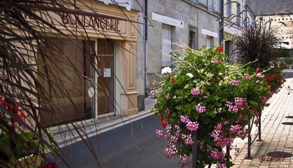 Am inceput mai intai cu o plimbare prin oras. Case albe, strazi atat de inguste, de parca sunt desprinse din vremuri indepartate, cand oamenii circulau pe jos sau cu caruta, ferestre cu jardiniere colorate, mici scuaruri cu bancute, poduri... cu adevarat un orasel superb. Dar cel mai si cel mai tare mi-au placut, la fel ca in Turquant, si la fel ca in fiecare sat al Loarei prin care am trecut, florile. Flori peste tot, multe flori. Flori in mijlocul strazii, la intersectii, pe trotuare, la intare, la iesire din localitate, la geamurile caselor, la poarta, pe garduri. Oriunde te uiti vezi ghivece cu flori colorate, proaspete si aranjate cu gust si eleganta. Mie imi plac la nebunie! Le ador! Dau un aer vesel satului, colorat, atragator, care parca te imbie la plimbare.