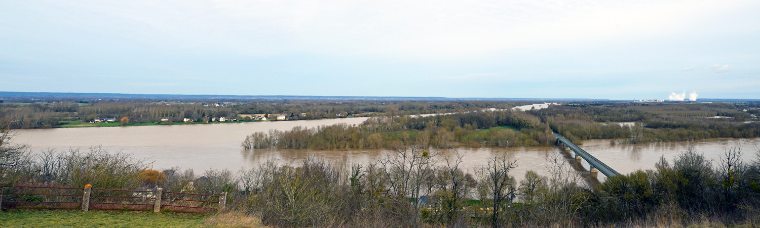 Confluența dintre Vienne (prim plan) și Loire (plan secund) în dreptul localității Candes Saint-Martin. În plan îndepărtat centrala nucleară de la Chinon