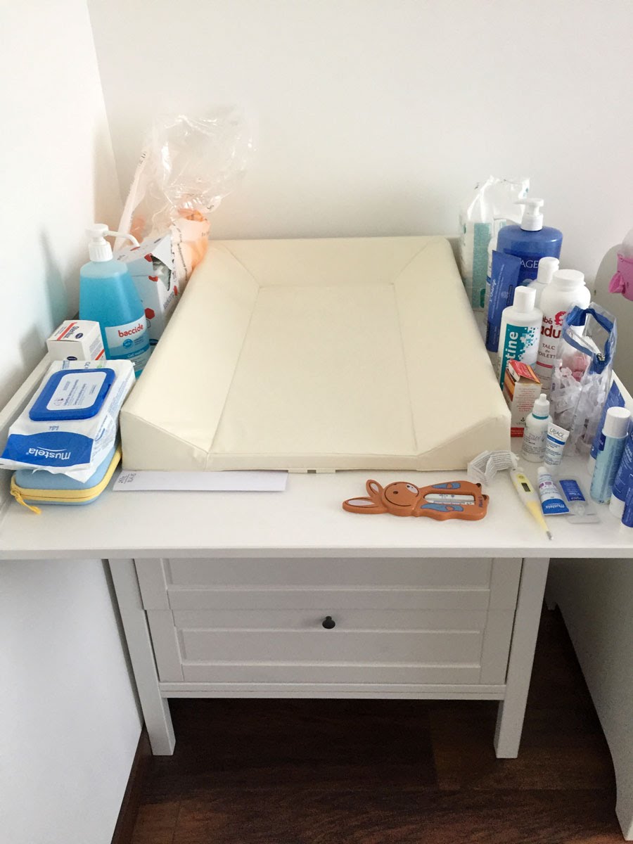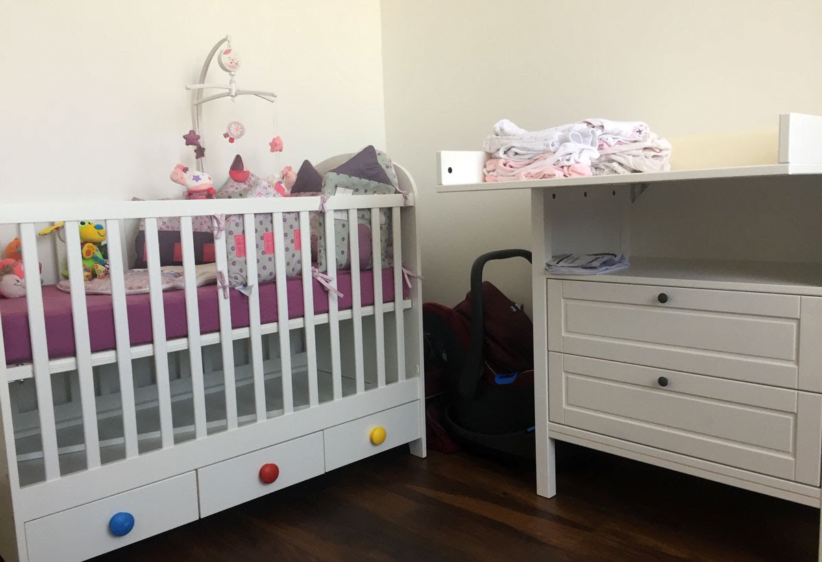 Tot pentru cameră am ales și o minunată comodă pentru schimbat, cum e moda pe-aici. Am luat două chiar 😂 . Una mai simplă pentru la baie, una mai fancy pentru dormitor. Da, ăla rămas nefolosit! Comoda de la baie am folosit-o foarte puțin, modelul nu era foarte stabil și mi-a fost cam teamă. Ikea, ce poți să ceri?! Pe cea din camera ei în schimb am folosit-o pentru schimbat până pe la 7 luni, după care am optat exclusiv pentru un modelul home-made, executat cu măiestrie de Andrei, montat la baie, mult mai practic și cu acces direct la apa de la robinet. Nu e rea nici cea cumpărată, mai ales că am ales un model a cărui placă de schimbat se strânge, iar acum folosește doar ca o simplă comodă pentru hăinuțe. Mi se pare foarte practic aranjatul hainelor pentru bebe în sertare decât în rafturile unui șifonier.