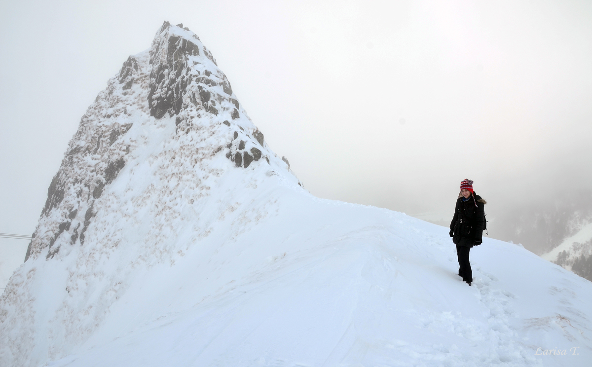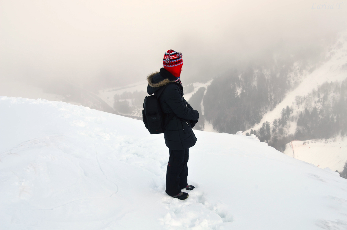 Ne-am plimbat puțin, pe lângă stația telecabinei, ne-am învârtit, am făcut niște poze, am profitat să facă și Azorel cunoștință cu zăpada, după care am intrat înăuntru. Ca la orice telecabină, există și un restaurant-cafeterie. Nu e deloc scump cum mă așteptăm, prețurile sunt exact ca la restaurantele de jos. Fiind deja ora 11, în timp ce noi beam un ceai au început să servească masa, pentru că desigur, v-am mai povestit, aici nu se servește masa când vrei tu, ci între anumite ore. Am zis că dacă tot suntem acolo să și mâncăm, sperând ca până mâncăm să se mai ridice ceața. Dar ce s-a ridicat?! Nici gând.