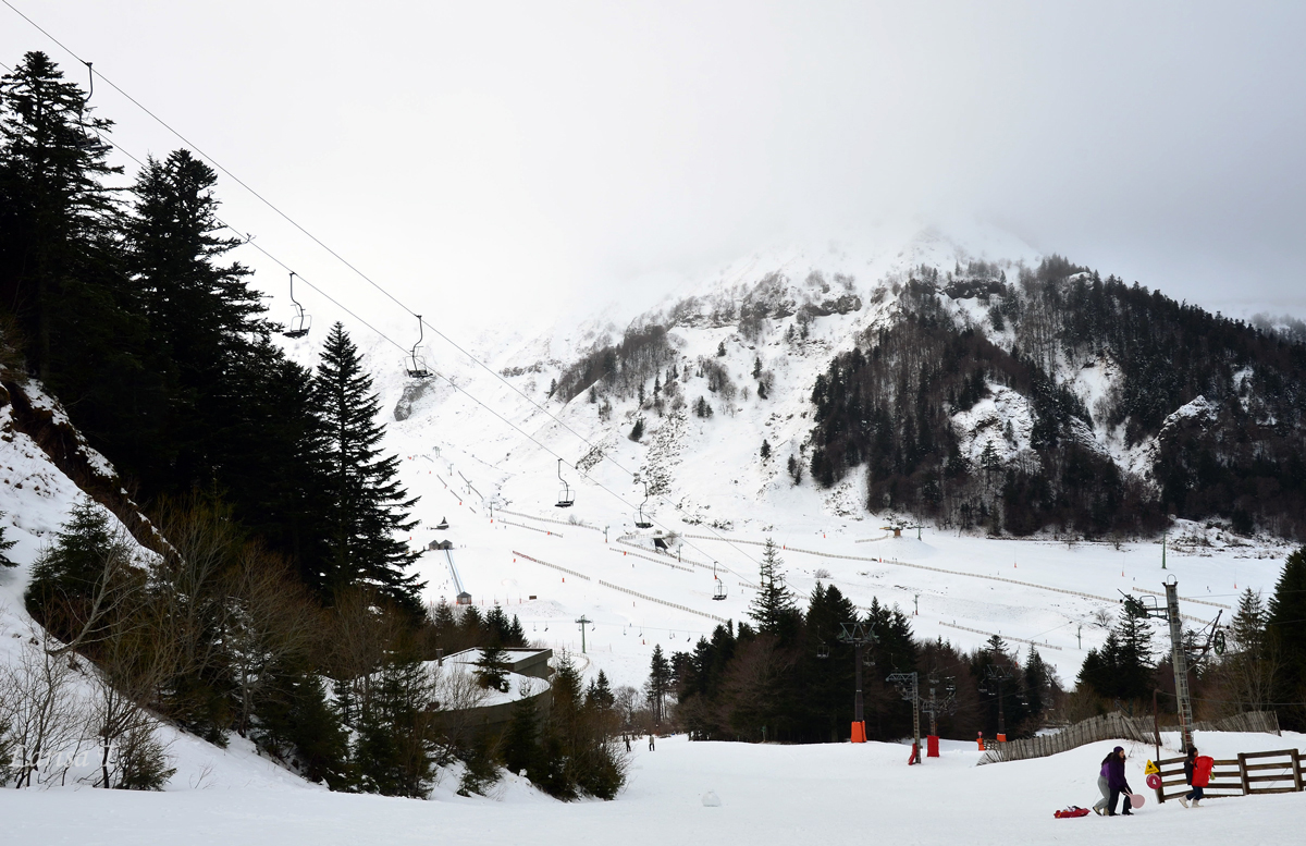 Am băut licoarea magică, după care am pornit către Pied du Sancy cu mașina. Pied du Sancy este un loc, la vreao 3 km de Mont Dore, exact la piciorul lu’ Sancy muntele. Aici sunt pârtiile de ski împrăștiate pe toți versanții, pe creste, pe sub versanți, peste tot pe unde s-a putut profita și s-au putut face. Tot aici sunt, implicit și instalațiile pe cablu, teleschi, telescaun, teleferic, tele-ce vreți voi. Aici este concentrată și toată populația, firește. Majoritatea schiază, însă mai sunt și unii ca noi care fac alte chestii, gen drumeții, snowboard, alpinism. Spre surprinderea mea, nimeni nu este aici doar să caște gura. Dacă nu ești cu mașina nu-i bai, sunt autobuze care vin din Mont Dore până-n buza pârtiei. Totul pentru bunăstarea turismului, ceea ce nu este un lucru rău, dimpotrivă.