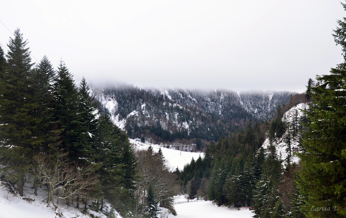 Ajunși jos ne-am oprit să mai bem un ceai și să punem țara la cale. Nimic nu prea avea rost cu vizibilitatea 0 care era. Dar nici să mă întorc în Mont Dore și să mă plimb prin oraș nu-mi venea, așa că am hotărât să pornim într-o drumeție mică. Nu prea știam exact pe unde mergem, în sensul că nu era un traseu marcat, dar era la origine o partie mai veche de schi, astăzi dezafectată, sub Les Dents Bouches. Drumul șerpuiește, la început, destul de lin și anost printr-o pădure de brad. Liniște și pace, doar sursur de izvoare. Mai apoi cotește brusc și urcă pe sub un fost telescaun nefuncțional. Pare lejer, dar se urcă nu glumă. Eu merg mai încet decât restul trupei, care mi-o ia înainte, dar mie îmi place așa, că mă pot bucura de peisaj și pot face poze.