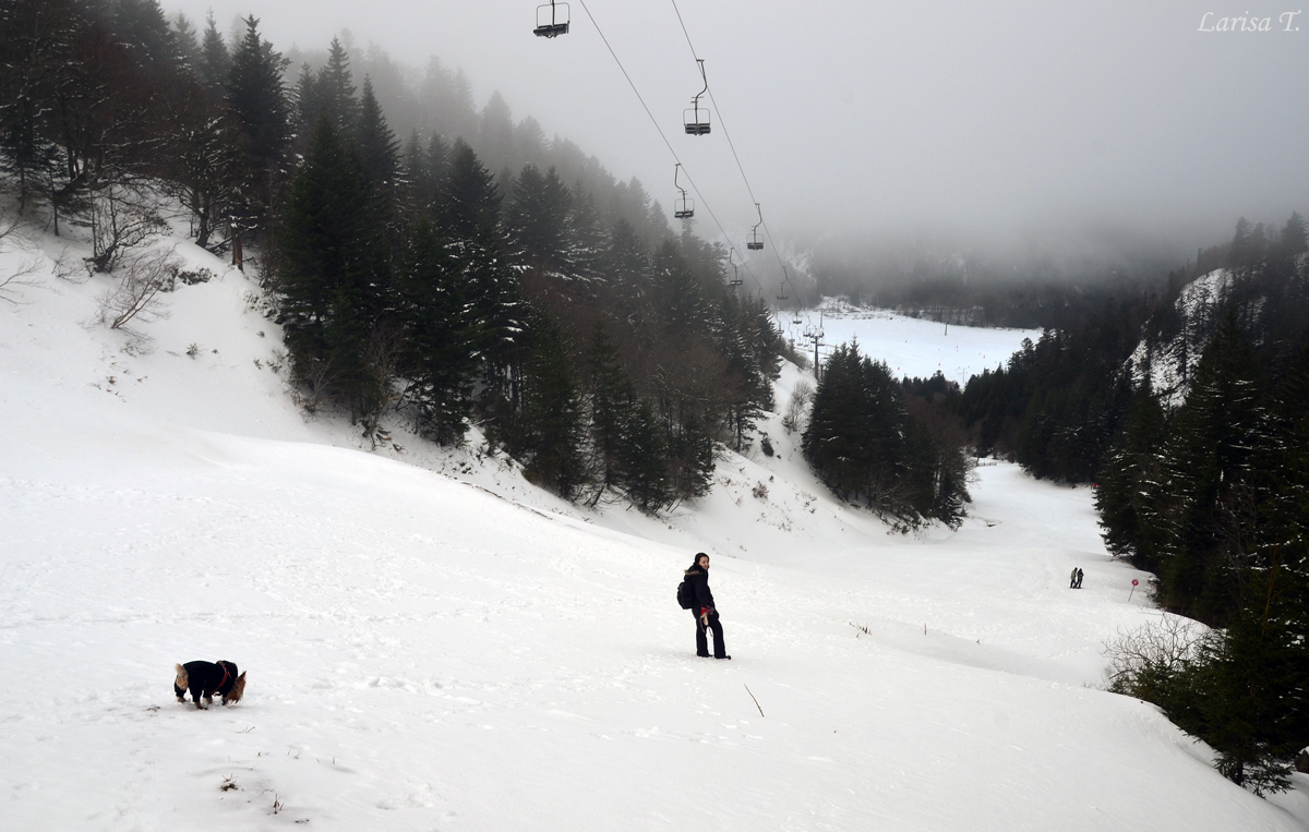 După vreo 2 ore ajungem la capătul telescaunului. Ceață era parcă și mai deasă, așa că decidem să ne întoarcem pe același drum. Nu avea nici un rost, oricum nu se vedea mare lucru. Și mâine e o zi până la urmă. Așa că ne întoarcem ușor, mai facem o poză, două, ajungem la mașină și pornim către Mont-Dore. După ce îmi schimb bocancii, care se pare că nu mai țin la zăpadă, o luăm la pas prin oraș, mai un vin fiert, mai o ciocolată caldă și terminăm la restaurantul despre care v-am povestit, cu un castron de brânză Mont D’or topită, cârnați, jambon, salată și cartofi fierți, toate acompaniate de un vin foare bun de Savoie.