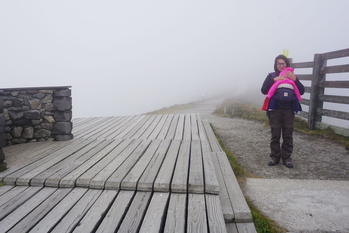 Există două variante de urcare pe Puy de Sancy cu telefericul, pentru că pe jos cu Erika în marsupiu nu m-aș fi încumetat, mai ales că nu cunoșteam traseul: una din Mont Dore, de la Pied du Sancy, un pic în afara stațiunii și alta de pe partea opusă, din stațiunea Super Besse. Niciuna din variante nu duce pe vârf, mai rămâne ceva de urcat și la picior, mai puțin din Mont Dore, mai mult din Super Besse, dar acceptabil, zic eu, cu un port-bebe în față, mai ales că poteca este foarte bine amenajată, cu podețe și trepte de lemn peste pasajele dificile. Pe jos sunt mai multe trasee, foarte faine din câte am văzut, unul care parcurge toată creasta, așteptăm doar ca Pisica să mai crească să le încercam.