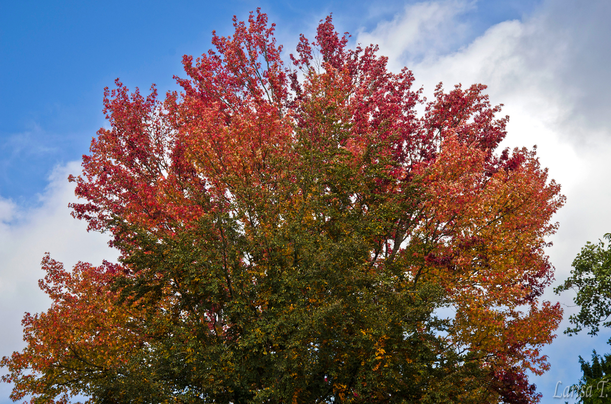 Cam asa este pe aici, simti toamna cand calci pe covorul de frunze, altfel, daca ridici privirea vei crede ca e vara :). Bine, nu peste tot. E ciudat oricum amestecul de ruginiu cu verde intens…