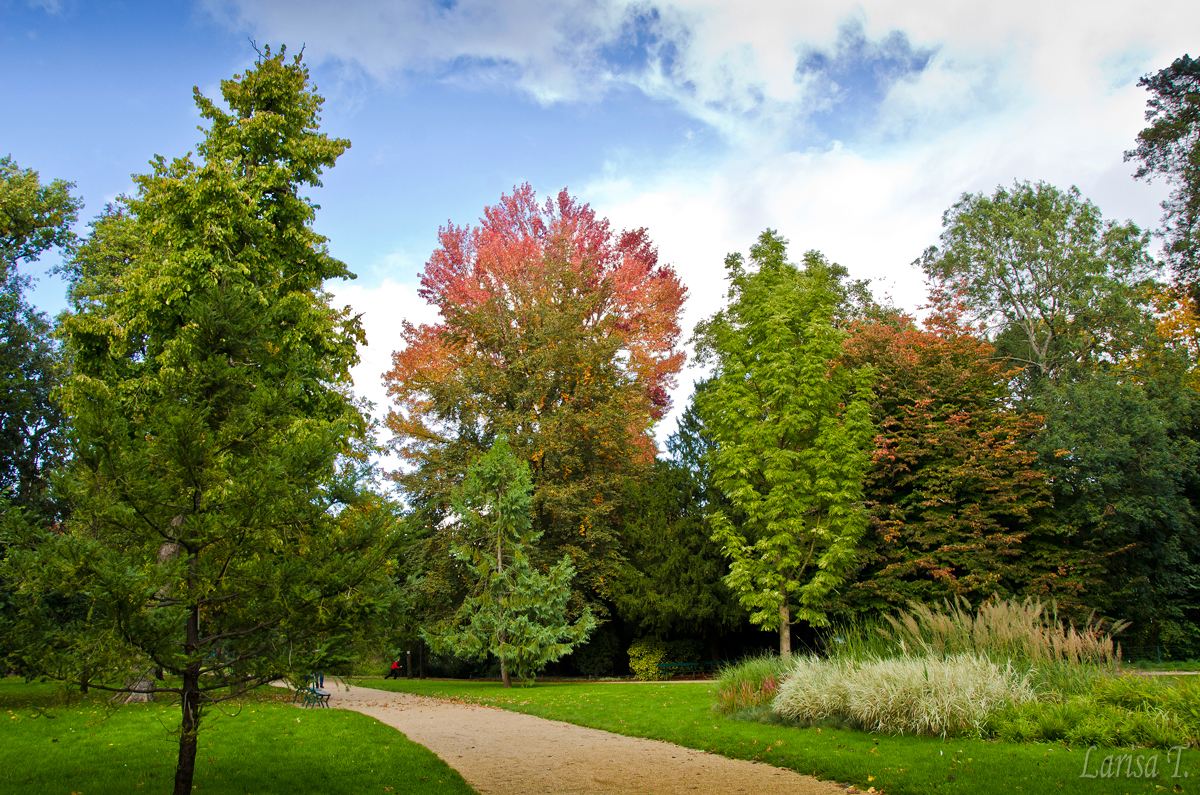 Grădina Botanică din Tours e ceva mai departe de mine, așa că nu pot ajunge acolo chiar în fiecare zi. În schimb este ceva mai întinsă, mai diversificată și ceva mai sălbatică decât parcul de lângă casă. Acum nu vă închipuiți că nu este îngrijită, din contră, însă nu-ți da senzația de aranjare până la cel mai mic detaliu, ci o senzație plăcută de libertate. Aici am găsit ceva mai mulți arbori sau arbuști cu frunze căzătoare, așa că m-am putut bucura un pic de culorile toamnei. Și aici predomină verdele, dar doar atât cât să dea o pată de culoare. Oricum, era tare fain! Nu știu dacă oamenii ăia au aranjat peisajul să arate așa tomnatic, nu știu dacă au fost gândite combinațiile de verde cu galben-rugiuniu, sau doar natura și-a făcut meseria, dar ți-era mai mare dragul să te plimbi. Nu știu nici dacă pozele mele vor reda atmosfera, dar vă spun sincer că, spre surprinderea mea, am petrecut o după-amiază mega-plăcută.