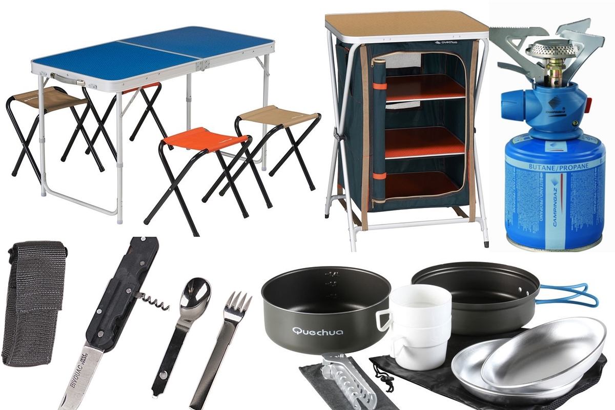 În afara articolelor de dormit, mai dispunem, firește, de articole necesare servirii mesei, mai exact o masă pliantă cu 4 scaune (tot pliante), foarte practică și ușor de transportat, un reșou de camping cu arzător și butelii de voiaj încărcabile, iar anul acesta ne-am „îmbogățit” cu un dulap cu etajere pliabil, foarte util în sejururile mai lungi la depozitarea alimentelor și ustensilelor, astfel încât să nu mai stăm cu ele înșirate pe masă, sau pe jos. Tot pentru mâncat avem de vreo câțiva ani (și încă rezistă) un set de veselă cu crătiți, farfurii și căni una-n alta, marca Decathlon, la care am adăugat câte un set-tacâmuri, briceag din acela multi-funcțional, cu lingură și furculiță, tirbușon, desfăcător. Îmi închipui că nimeni nu se naște învățat și că foarte mult nu știu despre toate acestea, cum nu știam nici eu de altfel la început, dar totul se deprinde cu timpul, fie aruncând un ochi din când în când la magazine de specialitate, fie de nevoie la față locului, sau chiar „furând” de la alții. De exemplu vara asta am simțit nevoia unui recipient în care să-mi fac cafeaua dimineața și nu mare mi-a fost mirarea când la Decathlon am găsit un ceainic de camping despre care habar n-aveam că există!