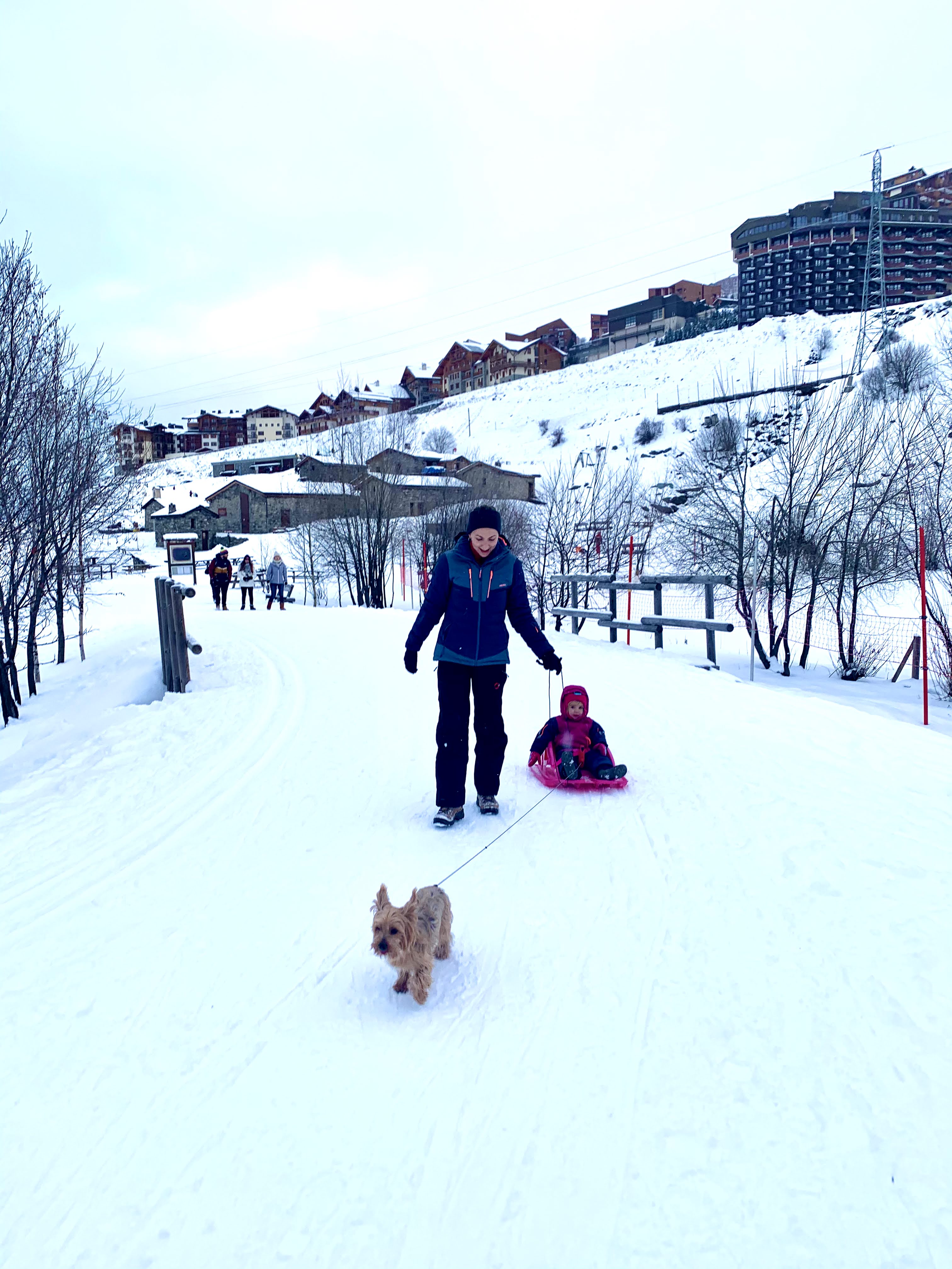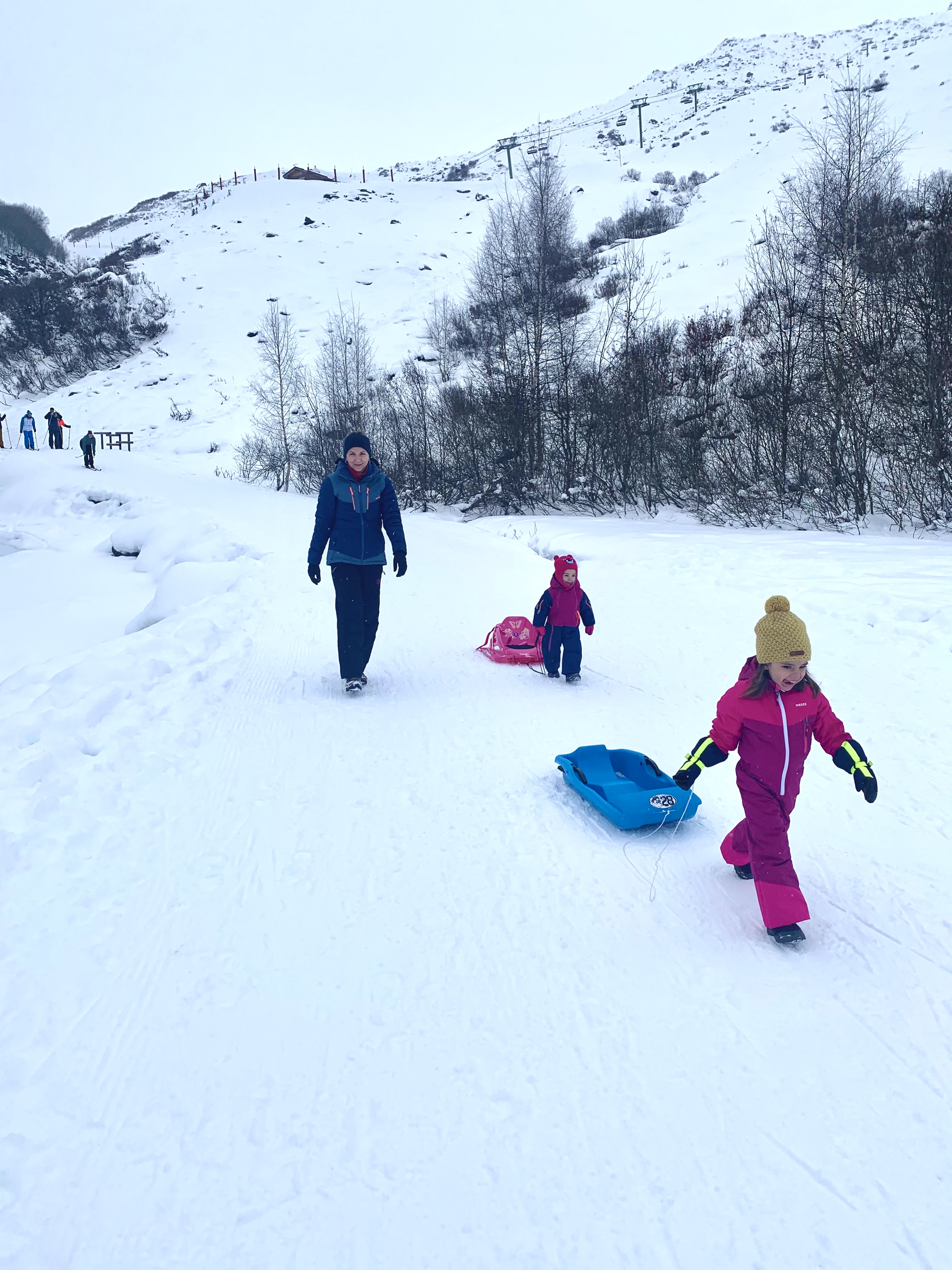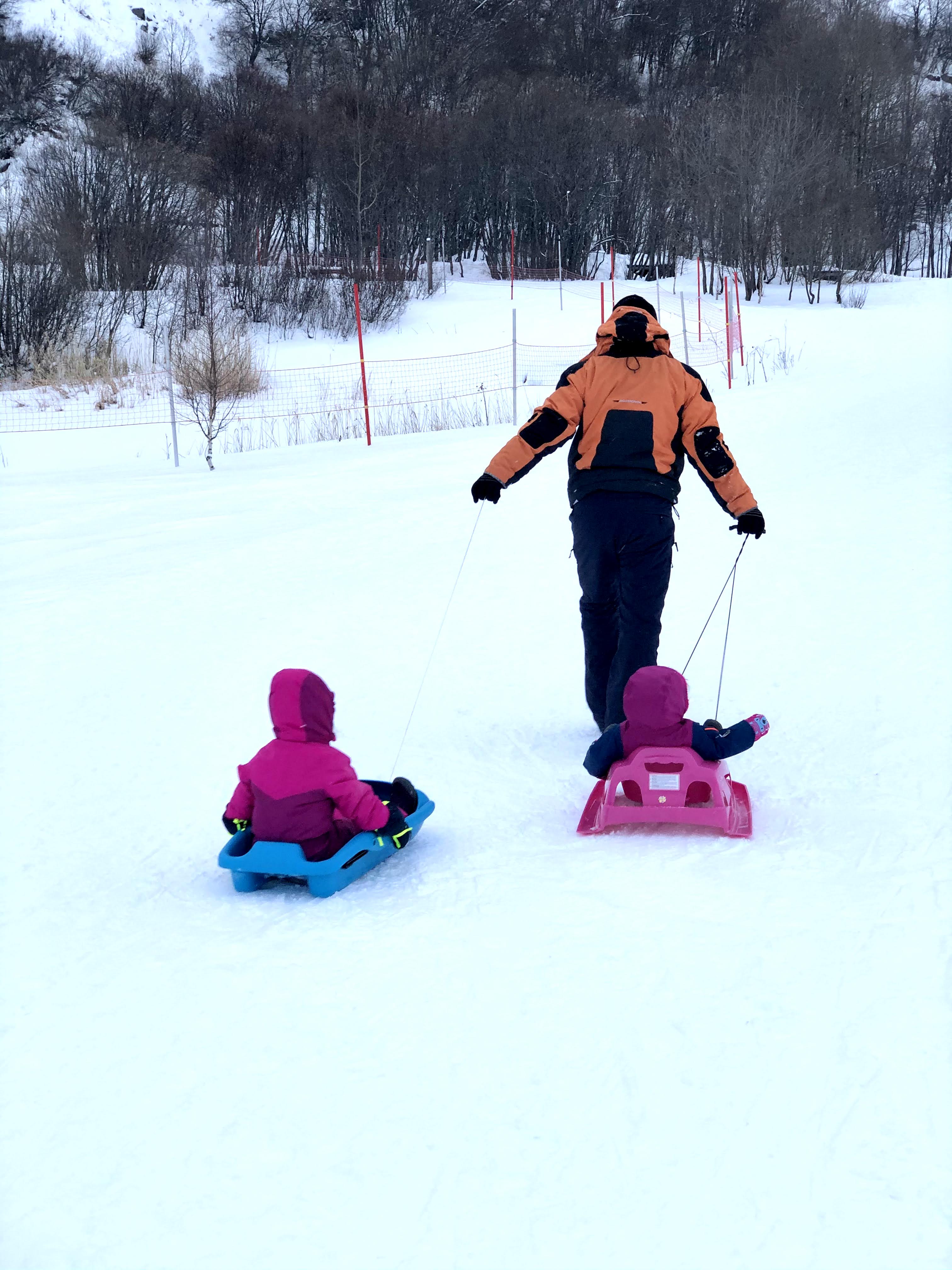 Păi… în primele două zile ne-am enervat. Treaba cu parentingul este că el nu este întotdeauna ca în cărțile de specialitate. Noi voiam să facem ceva, fetele doreau altceva, așa că se lăsa cu mârâieli, plânsete, frustrări, timp pierdut și nervi întinși la maxim. Viața e alta cu copii mici, la fel și vacanțele, v-am mai zis. Prin urmare, în următoarele zile ne-am readaptat mai eficient planurile zilnice la copii, mai exact activitatea principală a devenit datul cu sania de dimineață până seara și totul a mers mult mai bine.