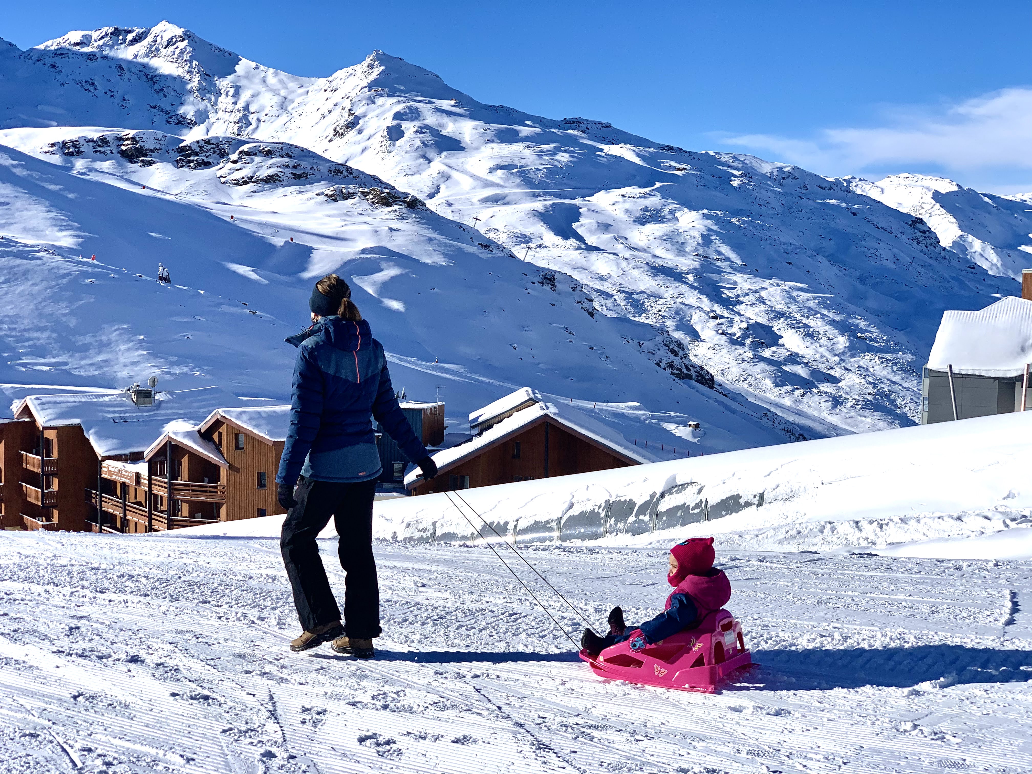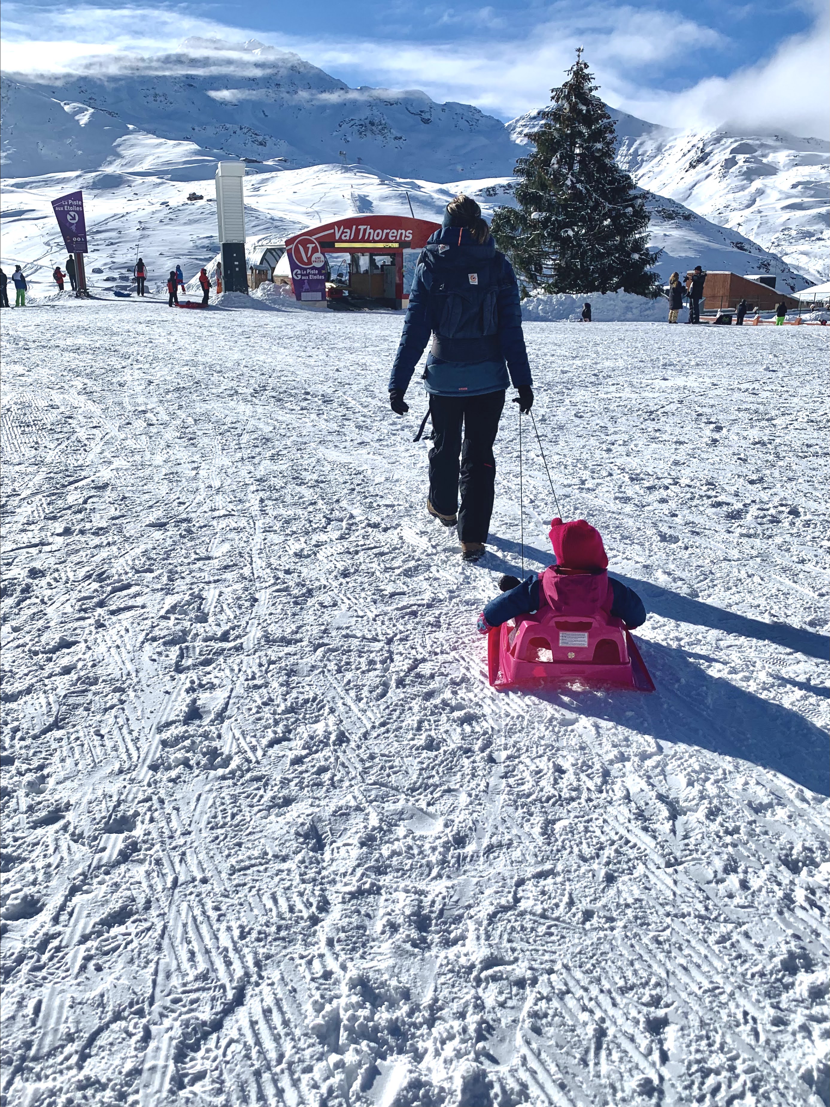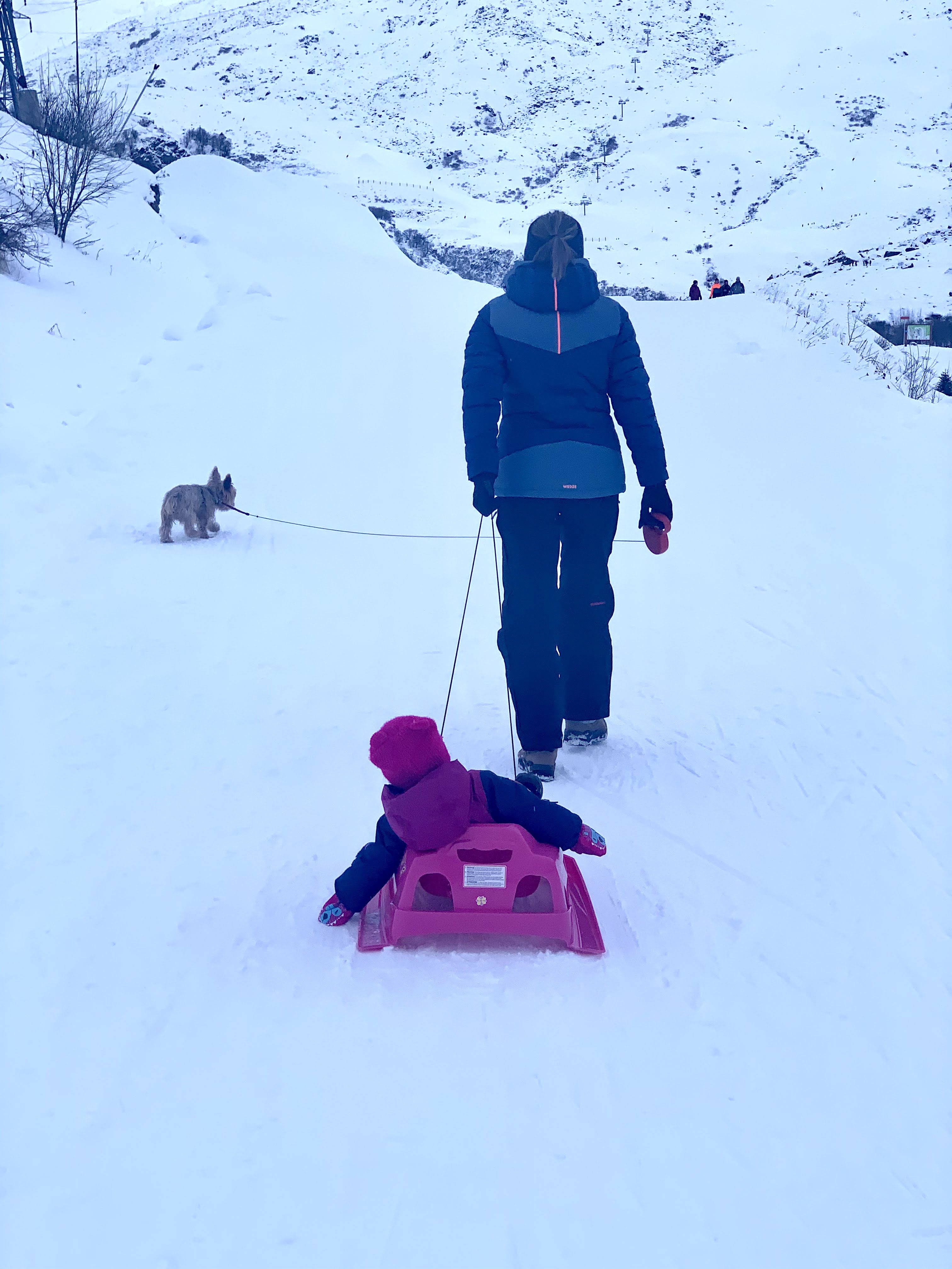 În prima zi ne-am luat echipamentul de rachete, rucsaci în spate, Daria în bebe-rucsac, Erika pe jos, ba chiar i-am închiriat și ei o pereche de rachete de copiii, în caz că. L-am prins pe Azorel în lesă și am pornit pe un traseu lejer, familial, studiat în prealabil, din stațiunea Val Thorens către Lac de Lou. Nici n-am ieșit bine din stațiune că lucrurile au început deja să meargă prost: Daria se fâțâia, voia pe jos, Erika se plângea că deja a obosit și că vrea înapoi, rachetele nu îi plăceau, deci trebuia să le cărăm tot noi. Îmi venea să mor de ciudă. Am hotărât să ne întoarcem în stațiune și să facem altceva. După ce am luat masa de prânz, am dat rachetele și am închiriat o sanie. Lucrurile au stat ceva mai bine în acea după-amiază când n-am făcut altceva decât să ne dăm cu săniuța. Pârtii de săniuș erau multe, ba chiar am descoperit covorul-rulant care funcționa și ne scutea de cărat sania la deal.