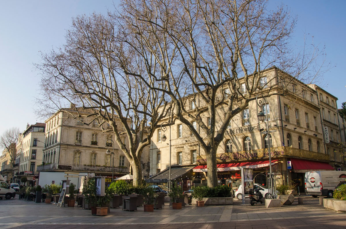 Fiindcă în noaptea de dinainte am fost cazați la un hotel din imediata vecinătate a orașului și pentru că s-a întâmplat excepția de a ne trezi devreme, la 9 dimineața eram deja parcați și ne beam cafeluța într-o braserie de lângă oficiul de turism, situat pe rue de la République, o arteră importantă și impozantă a orașului. Nici măcar barmanul nu sosise la datorie, ne-au servit niște persoane despre care habar nu am ce funcție aveau prin local. După doza de cofeină necesară functionării am pornit către centru, lungind același bulevard larg și bordat de magazine, cu mistralul în față suflând ca nebunul de aproape că ne dădea jos. De Azorel nu mai vorbesc, noroc că era bine ancorat în lesă. Am ajuns rapid în Place de l’Horloge, piața ce-și datorează numele, încă din secolul XVI, ceasului instalat în turnul mănăstirii Saint Laurent, ce domină de altfel locul, alături de Hôtel de Ville, vechea primărie a orașului, construită în stil gotic. Piața este mărginită de diverse localuri, cu terase stradale, foarte animată la orele prânzului și seara, cam pustie la ora la care am ajuns noi.