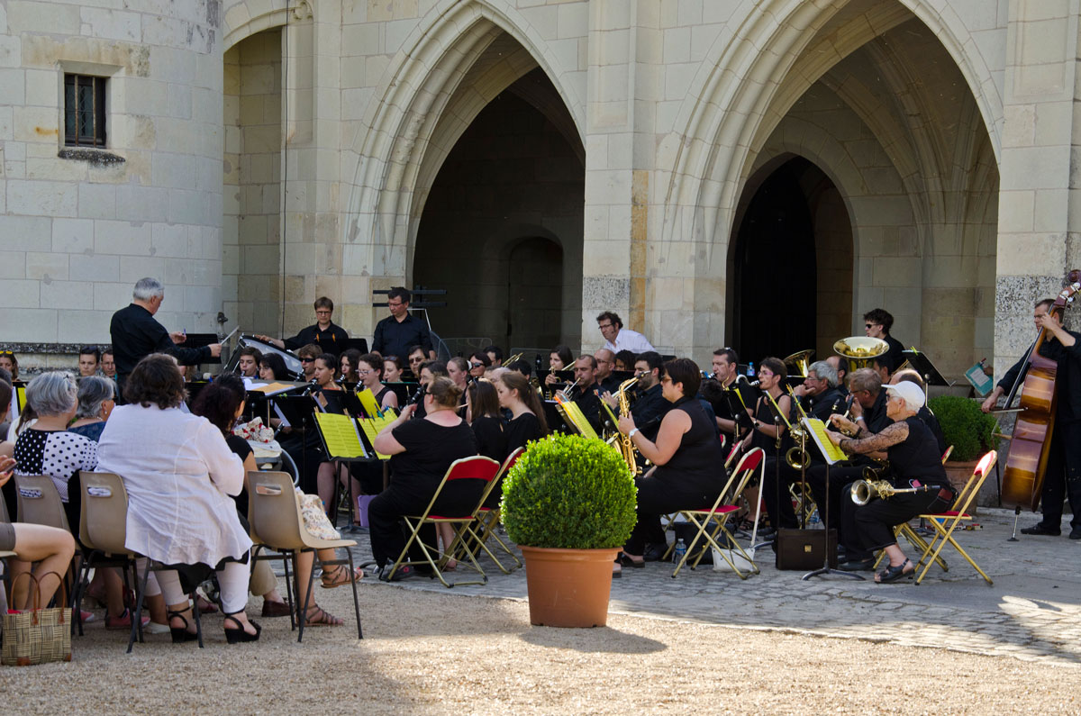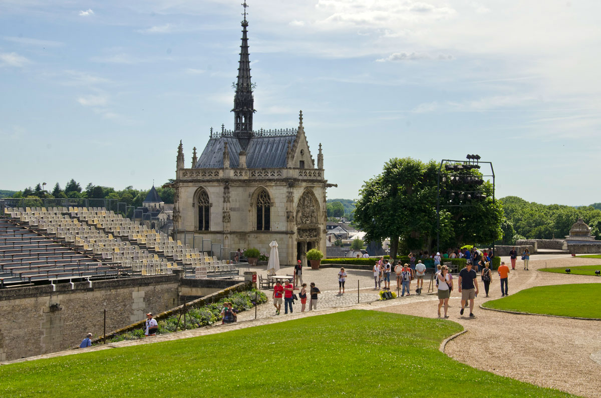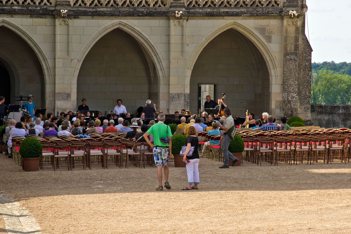 Cum mă aflam în vizită la Castelul Amboise pentru a treia oară, plimbarea s-a desfășurat rapid, în timp ce interiorul răcoros a constituit o adevărată binefacere. Am ieșit prin spate pe Terrasse de Naples, am ocolit prin grădinile italiene, pe sub impunătorul cedru de Liban, până la turnul Heurtault de unde se poate admira conacul Clos-Lucé, ultima reședință a lui Leonardo Da Vinci, alături de întregul oraș, după care am luat un loc pentru concert, în Curtea de Onoare (cum sună!). Tot o binefacere pe canicula arzătoare a fost și ghereta amenajată în curte, de unde se puteau cumpăra bere, înghețată și răcoritoare, așa că am stabilt să rămânem acolo la o măsuță, mai bine decât pe scaunele special întinse pentru eveniment.