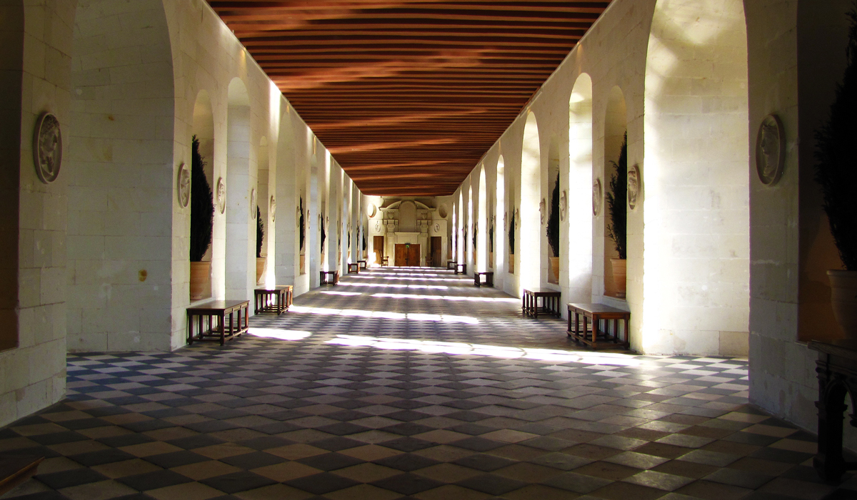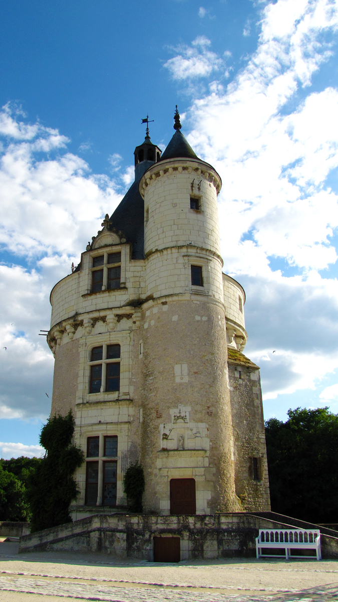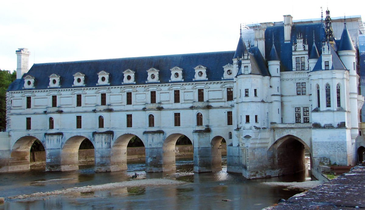 Într-adevăr, față de orice alt castel de pe Valea Loarei și față de orice altă construcție pe care am văzut-o până acum, Chenonceau are o arhitectură deosebită, fiind construit în formă de pod, cu arcade peste un râul. Interesant, nu? De fapt asta este ceea ce îl face celebru și cunoscut, pentru că altfel nu s-ar diferenția cu mult de restul castelelor din zonă. În perioada de vară nivelul Cher-ului este destul de scăzut, așa ca se văd mai bine pilonii podului, dând impresia de castel… cu multe picioare. Fix deasupra podului, în interior, este un colidor lung, cu multe ferestre, de unde poți admira apa în stânga și în dreapta, moment în care chiar realizezi că ești chiar deasupra ei. În rest, totul este destul de comun cu restul castelelor din regiune. Foarte frumoase sunt totuși aici aranjamentele florale, prezente în fiecare încăpere; dau un aer atât de viu și proaspăt.