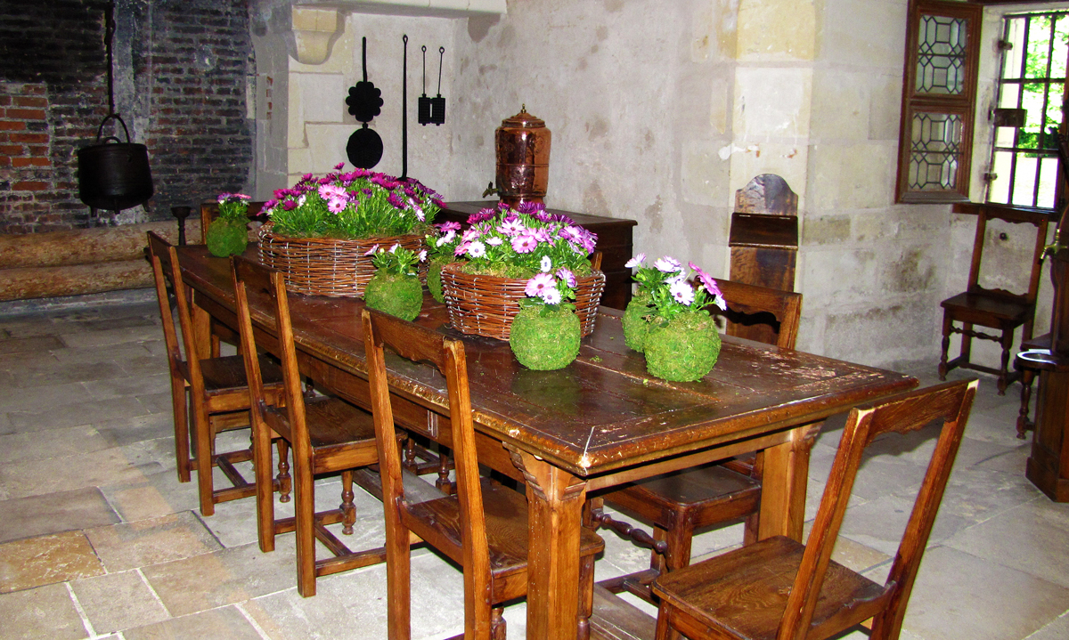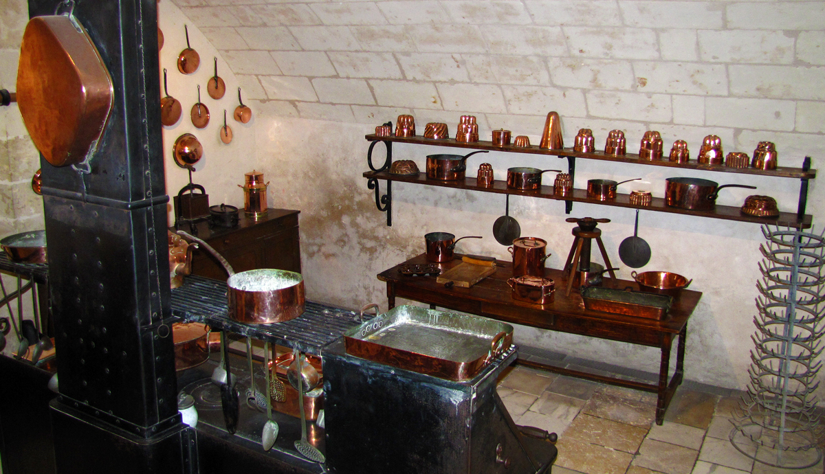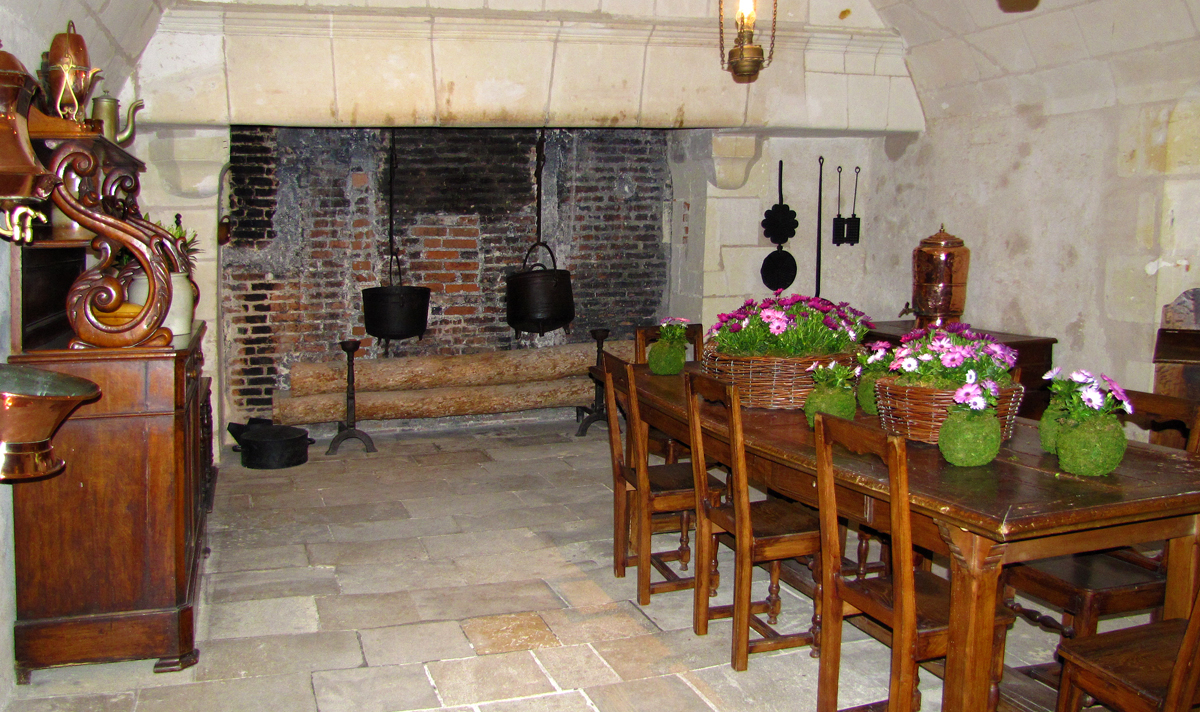 Dintre toate încăperile castelului Chenonceau, bucătăriile impresionează cel mai tare. Au foarte multe încăperi și anexe, o sală de mese, cămară, măcelărie, magazii, prin care tot urci și cobori, asta deoarece bucătăriile nu se află nicăieri altundeva, decât în pilonii podului. Acest lucru era foarte benefic pentru descaracarea alimentelor, care veneau cu barca pe râu. Inițial nu știam asta și chiar mă întrebam, unde or fi situate bucătăriile de tot urci și cobori trepte, ca să treci din una în alta. Camerele sunt foarte mari, pline de ustensile, crătiți, farfurii și alte instrumente, semn că oamenii erau foarte gurmanzi la vremea aceea.