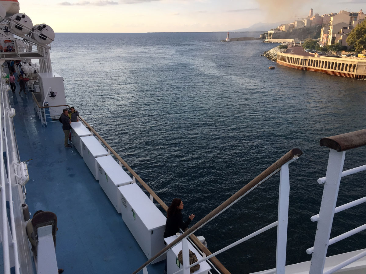 De fiecare dată când am mers in Corsica cu vaporul am ales compania Corsica Ferries pentru că prețurile sunt chiar ok și pentru că transportă animalele de companie pe punte, față de restul companiilor maritime care fie nu transportă deloc, fie o fac la cală, într-un spațiu special pentru animale. Corisca Ferries operează in Franța din orasele Toulon si Nisa, iar de obicei noi alegem plecarea și sosirea în orașul Toulon, întrucât este oleacă mai aproape de casă. Insă la ultimul drum din Corsica, cel din septembrie de anul trecut, am acostat la Nisa, nu pentru că am dorit neapărat așa, ci pentru că acolo acosta vaporul care ne convenea nouă ca orar. Așa că am ridicat ancora la Bastia, pe la ora 8 dimineața, ceea ce ne-a permis să admirăm orașul luminat de primele raze calde de soare. Mi-a părut un pic rău că lăsasem aparatul foto în mașină (nu ai acces la mașină pe durata traversării!), mi-ar fi plăcut să imortalizez Bastia așa cum se prezenta în acea dimineață, însă m-am mulțumit cu două-trei poze făcute cu telefonul și cu gândul că nu prea este nimic de fotografiat pe vapor, cel puțin n-o să mă mai car cu el în geantă, nici n-o să-i mai port grijă.