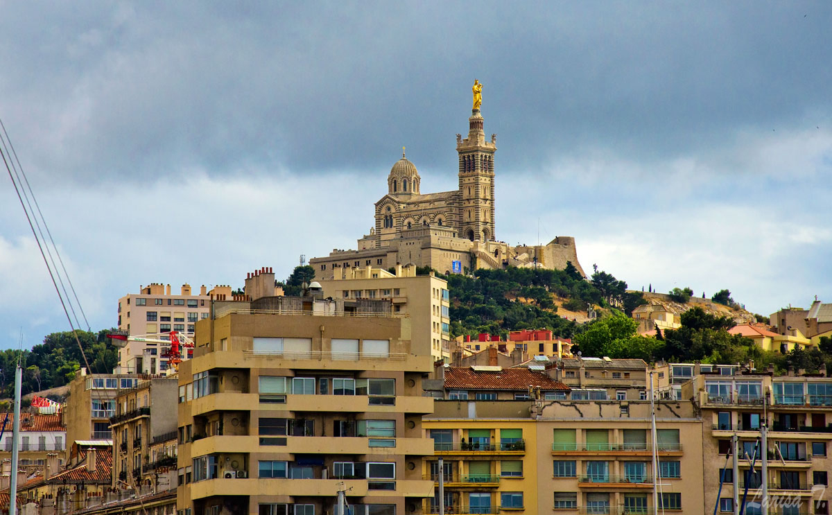 N-am ratat nici Nôtre Dame de la Garde, basilica din vârful dealului, ce veghează orașul. Fiind singură în ziua cu pricina și fiincă în Marsilia animalele de companie nu-s autorizate în autobuze, am luat trenulețul turistic până acolo. E o variantă mai scumpă recunosc, însă la momentul respectiv n-aveam de ales. În plus trenulețul te duce prin multe locuri importante, te lasă sus, te plimbi în voie cât vrei, după care același bilet îți permite să cobori cu alt trenuleț. Minunat acolo sus deasupra orașului, mai ales că era o zi senină! Priveliștea asupra orașului, a împrejurimilor, a mării și a insulelor este magnifică. N-am intrat înăuntru pentru că n-aveam voie cu Azorel (de fapt n-aveam voie cu Azorel nici măcar în curtea bisericii, totuși am intrat!), dar sunt convinsă că în realitate mozaicurile interioare-s foarte faine, eu eu am rămas cu ce-am văzut în poze. Cu siguranță e un loc pe care nu trebuie să-l treci cu vederea dacă ajungi aici, însă locul care mi-a plăcut cel mai mult din tot orașul a fost Cornișa.