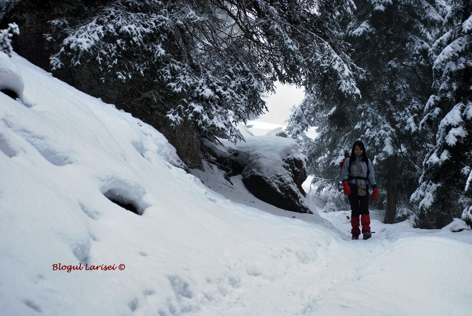 Traversam o padure de brazi, pe o poteca ce deschide parca un culoar printre acestia. Brazi mai mari, brazi mai mici, toti sunt atat de falnici si impunatori, asa cum sunt ei verzi si imbracati in nea. Pe jos un adevarat covor de zapada neatinsa care stralucea ca o pulbere de diamante. Peisajul era de basm, ca in povestile din copilarie.