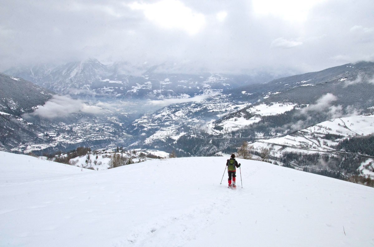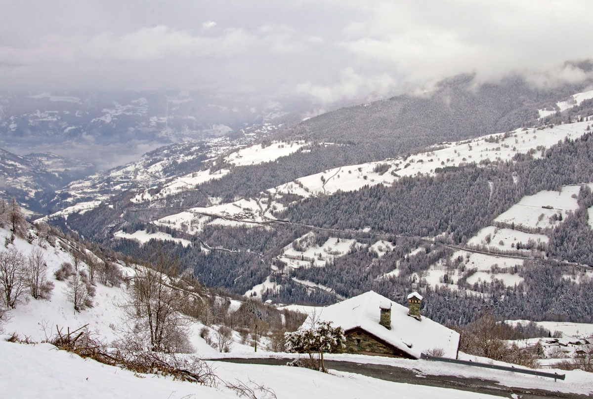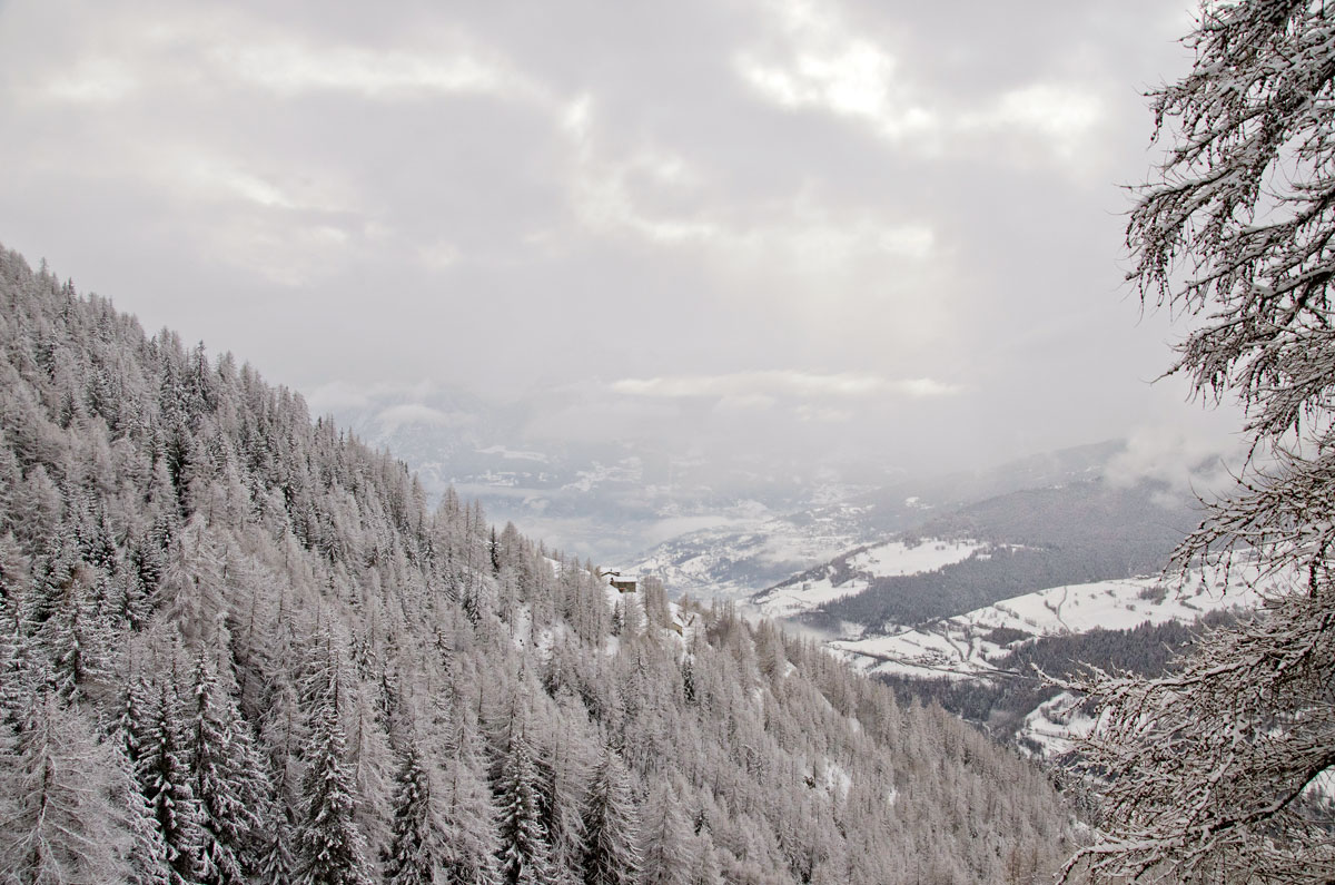 A doua zi în Alpii Italieni urma s-o petrecem tot pe munte deși vremea arăta în continuare mohorâtă. Ninsese, așa că zăpadă aveam din belșug, însă soare și vizibilitate ioc. Întorsesem pe toate părțile harta primită la Cervacol în prima zi, hartă ce conținea traseele de iarnă pe pe Valea San Bernardo și deși aveam în plan să hoinărim și prin alte masive, am sfârșit tot prin a alege ceva în zonă. Din localitatea Allein, aflată nu departe de satul Gignod unde eram cazați, porneau două trasee de rachete în buclă, trasee destul de întortochiate, ambele ducând pe același drum șerpuit la refugiul Alpe Baravex (1925m), coborârile făcându-se pe cărări diferite. Am zis să mergem la fața locului și-om vedea noi pe parcurs spre care ne orientăm.
