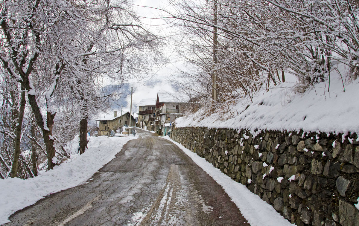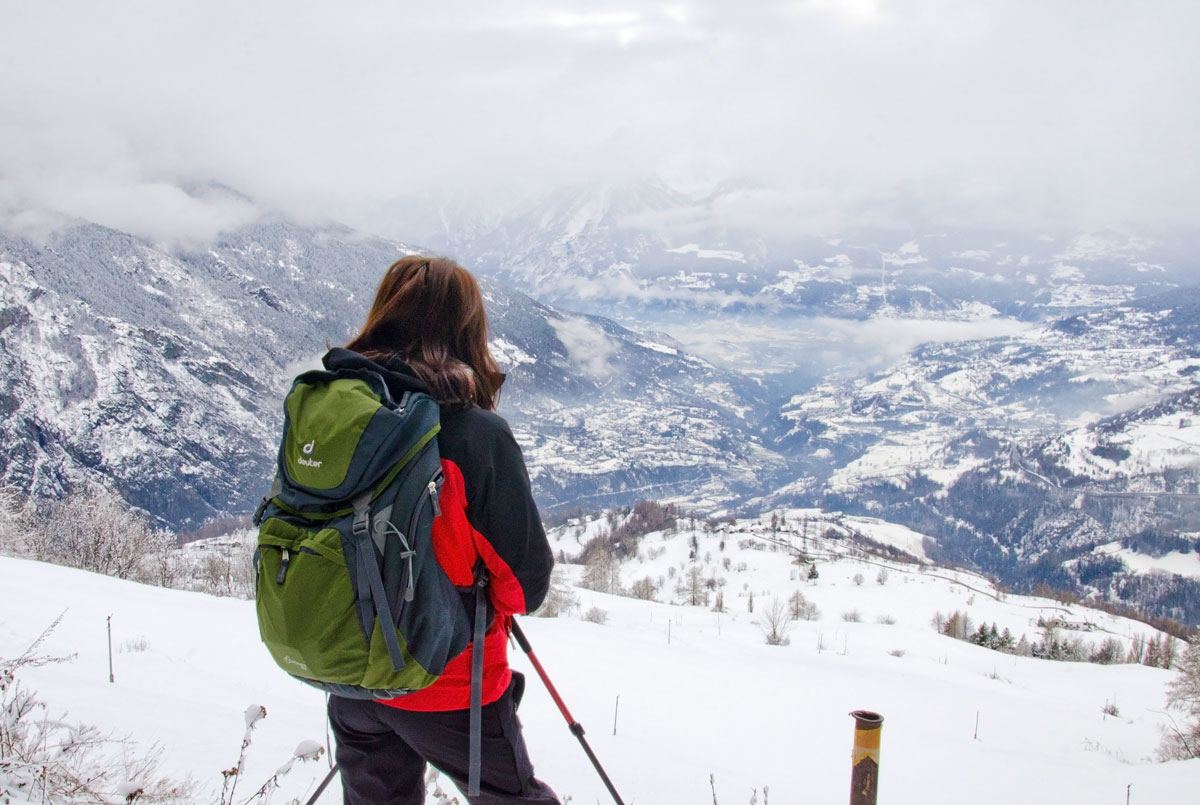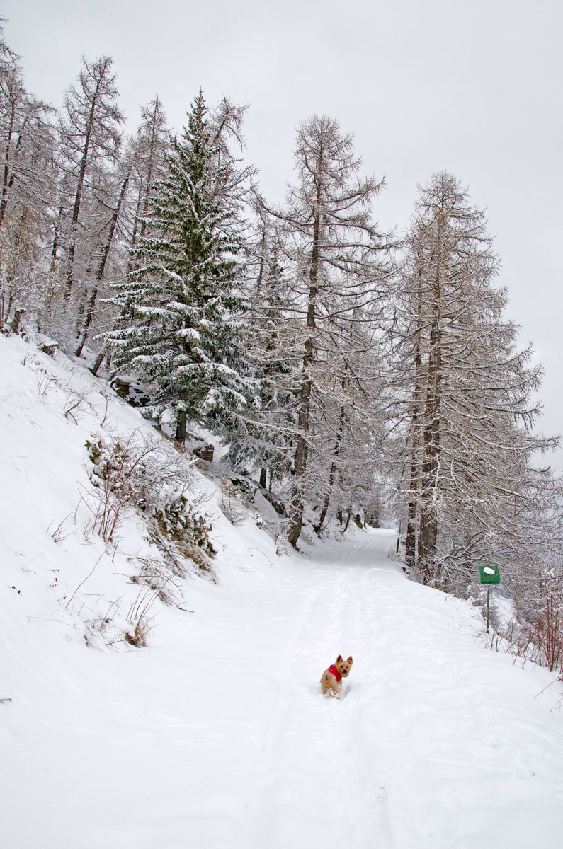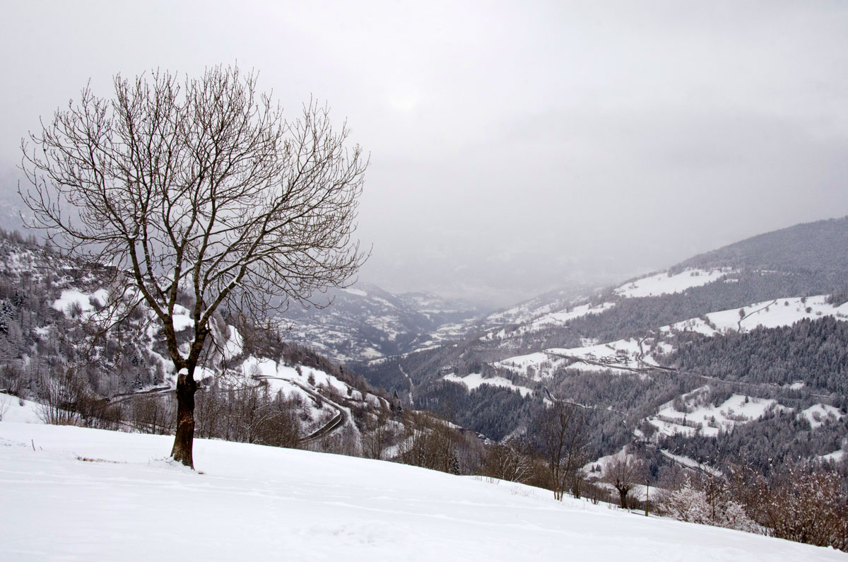 A doua zi în Alpii Italieni urma s-o petrecem tot pe munte deși vremea arăta în continuare mohorâtă. Ninsese, așa că zăpadă aveam din belșug, însă soare și vizibilitate ioc. Întorsesem pe toate părțile harta primită la Cervacol în prima zi, hartă ce conținea traseele de iarnă pe pe Valea San Bernardo și deși aveam în plan să hoinărim și prin alte masive, am sfârșit tot prin a alege ceva în zonă. Din localitatea Allein, aflată nu departe de satul Gignod unde eram cazați, porneau două trasee de rachete în buclă, trasee destul de întortochiate, ambele ducând pe același drum șerpuit la refugiul Alpe Baravex (1925m), coborârile făcându-se pe cărări diferite. Am zis să mergem la fața locului și-om vedea noi pe parcurs spre care ne orientăm.