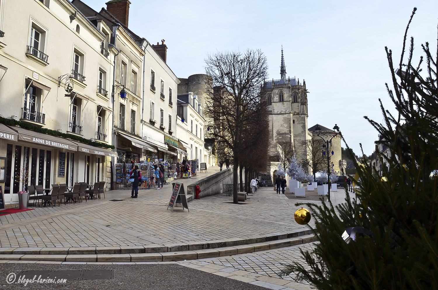 În Amboise, ca în multe alte orașe din regiune, printre care și Tours, duminica vine piața. Pe o străduță pietonală, paralelă cu Loara, comercianții se așează pe două rânduri lungi și îți vând de toate, de la cârnați, brânză și alte produse tradiționale, până la haine, încălțăminte, crătiți și oale. E un fel de târg, bazar, ziceți-i voi cum vreți. Nu este mare diferență față de piețele românești, doar că după ce se termină, adică după-amiaza, nu rămâne nimic pe jos, nici o hârtie, nici o cutie…rien! Auzisem de acesta piață de la prieteni, cum că ar fi cea mai mare din departamentul Indre-et-Loire. Într-adevăr este mai mare decât cele două piețe dominicale din Tours, însă, tocmai pentru că este mare și renumită, este, firește și foarte aglomerată. Sau poate era aglomerată din cauza Crăciunului, nu știu… Până la urmă n-am luat mare lucru, doar am căscat și noi gura pe acolo puțin, după care am plecat.