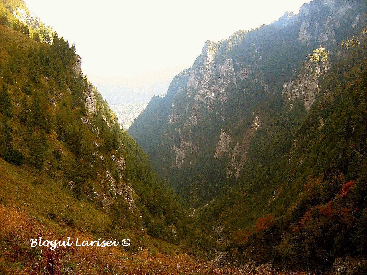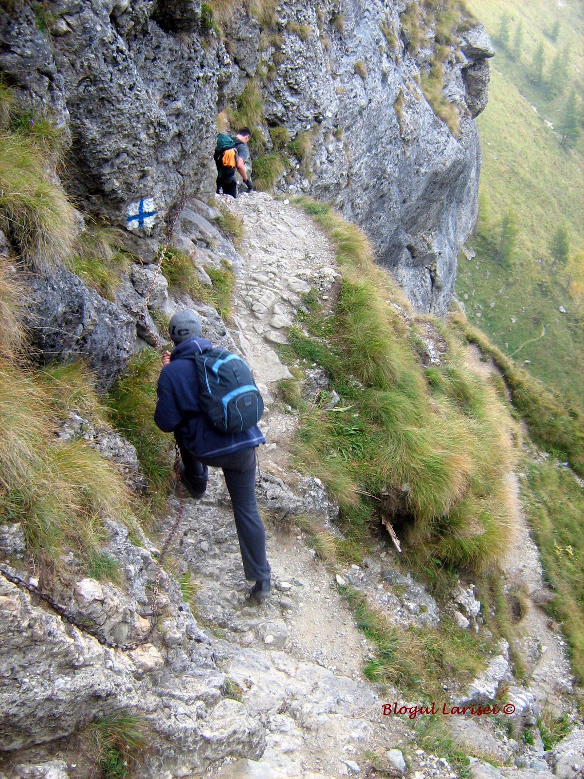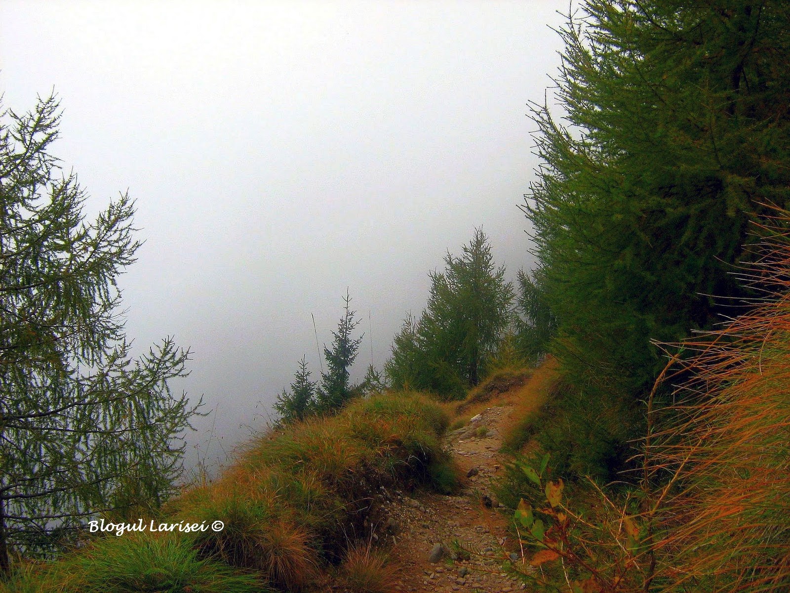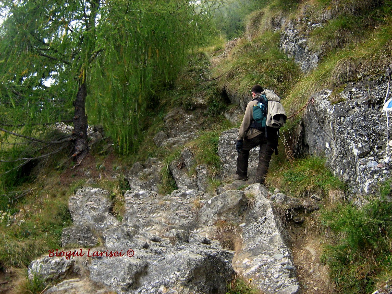 Ceva mai plictisitor, in mare parte, drumul serpuieste prin padure, traverseaza vale dupa vale, versant dupa versant, pana ajunge aproape de limita superioara a padurii, intr-o rariste de molid, in punctul „La Mese”. De aici incepe partea interesanta a traseului, asa cum imi place mie! Abia aici vedem „frumusetea”. Poteca de aici este sapata in stanca, urcand in serpentinne printr-o rariste de larice, un arbore deosebit de frumos si de verde.