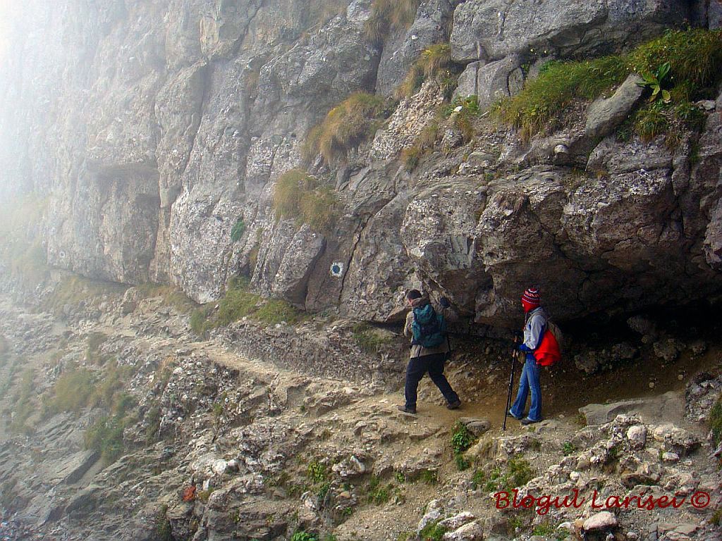 Continuam sa coboram pe serpentine sapate in stanca, mai traversam un valcel stancos si ajungem la scara din piatra. Alte serpentine dupa care traversam valea pe versantul opus, mai faem o poza doua, mai ne plangem de picioare, mai intram in alt horn, mai coboram niste stanci si uite asa ajungem…pe la jumatatea drumului :))! Ce credeati ca acasa? Nici gand!