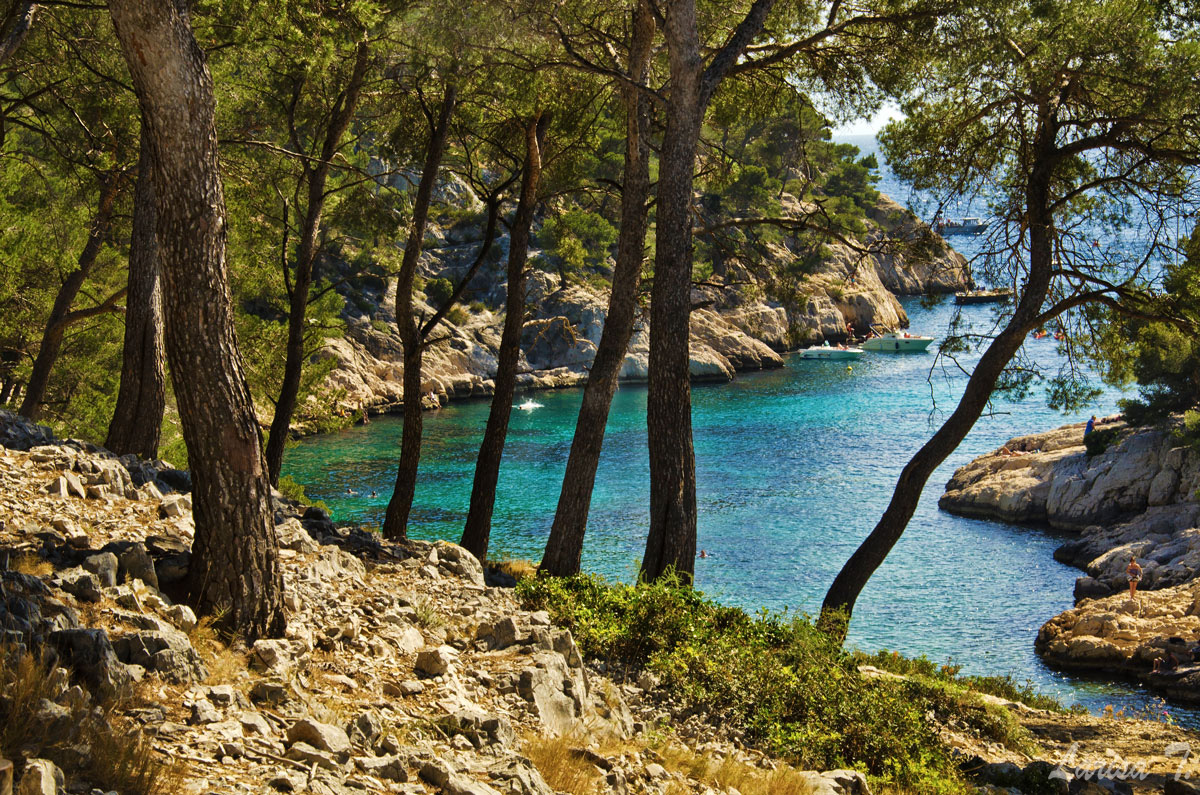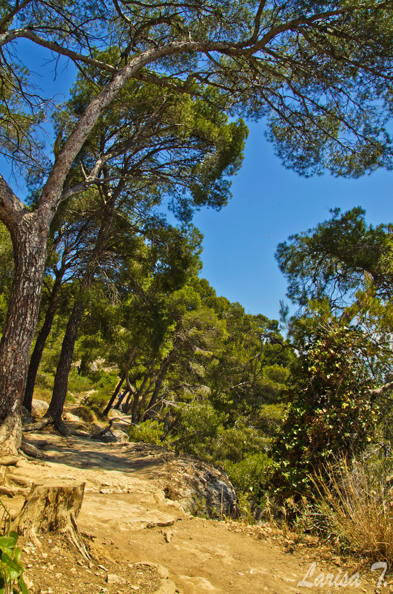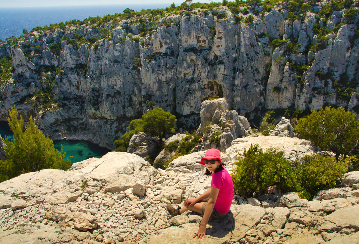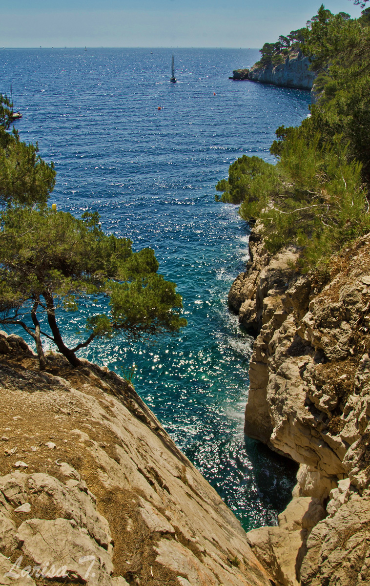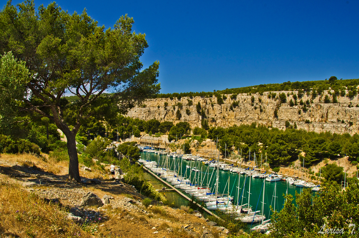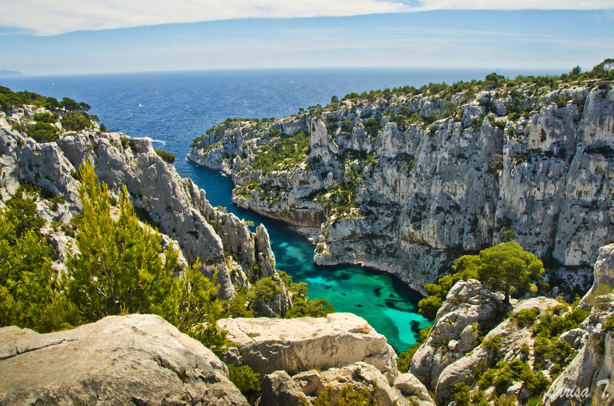 Traseul pe care l-am făcut noi pornește din Cassis, un orășel tare drăguț despre care vă voi povesti altădată, mai exact de lângă parcarea din Port Miou, unde am și lăsat mașina și ține marcajul GR51 urcând odată cu el pe platoul En Vau. Am început prin a coborî în prima calancă -Port Miou– transformată într-un mic port cu bărcuțe numa’ una și una, ca s-o urcăm firește pe partea opusă. Ajunși deasupra calăncii am luat o potecă paralelă cu marea, un pic cam îngustă ce-i drept și cu pietre destul de alunecoase, dar cu o panoramă splendidă asupra albastrului ireal. La momentul respectiv nu apreciam umbra copacilor, dar mai târziu am plâns după ea. Nu după mult timp am început coborârea pe niște cataroaie de toată frumusețea în cea de-a doua calancă –calanca Port-Pin, destul de aglomerată, lumea profitând aici de soare și de apa turcoaz a mării.
