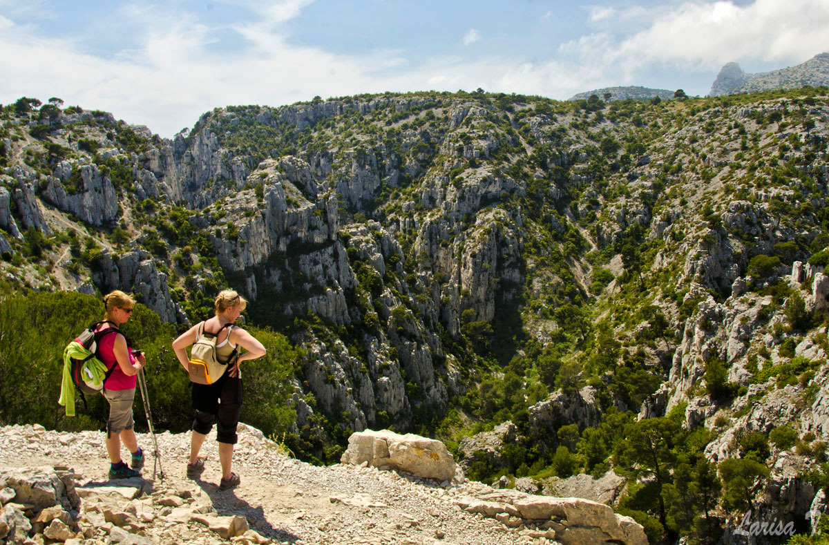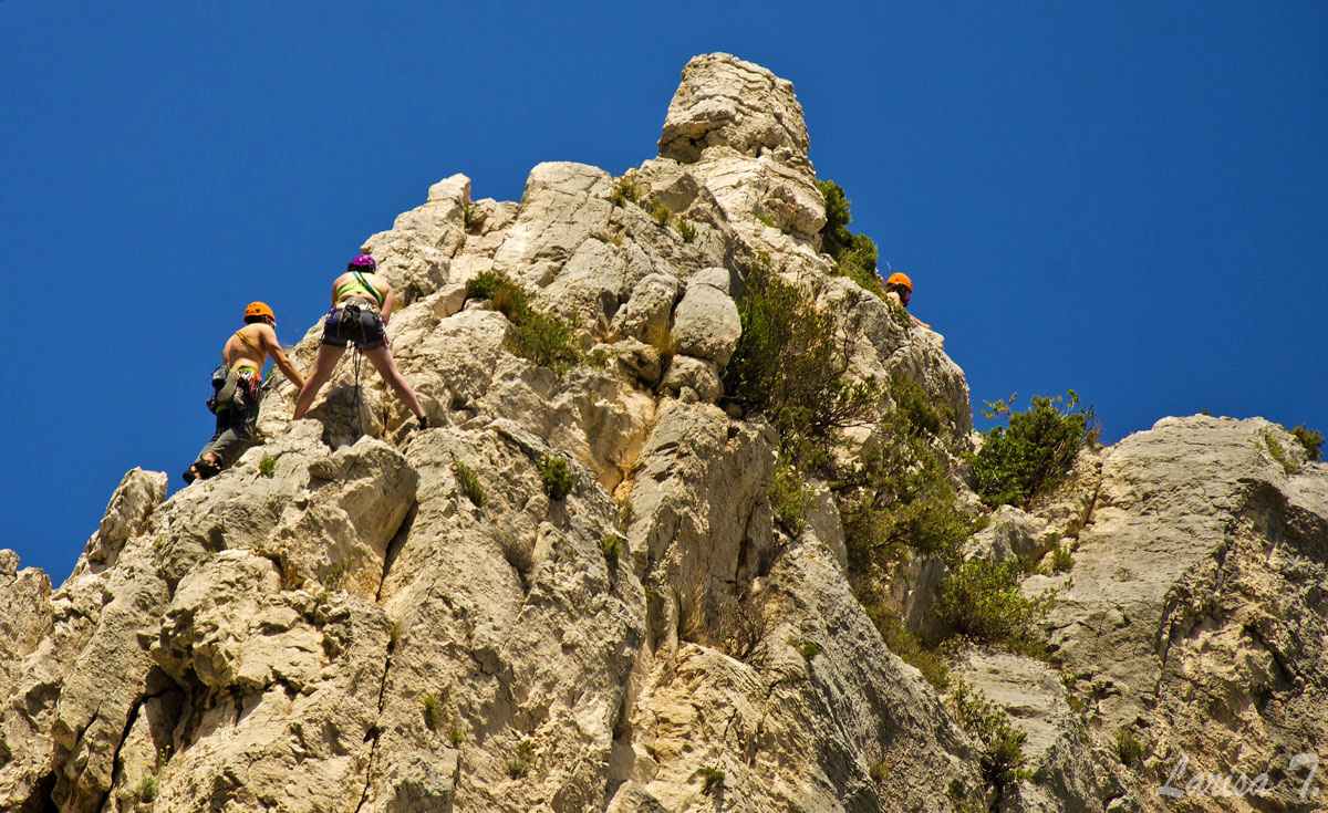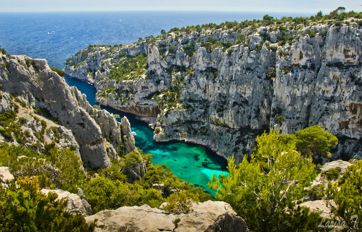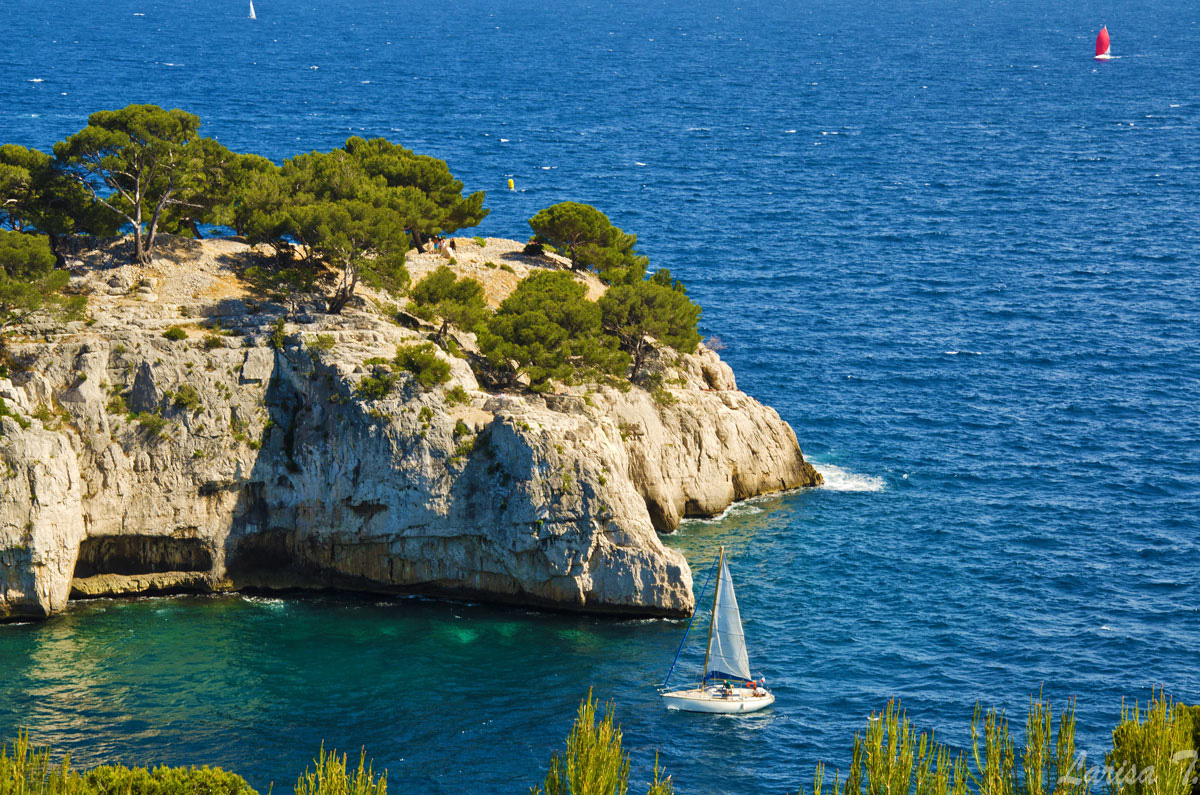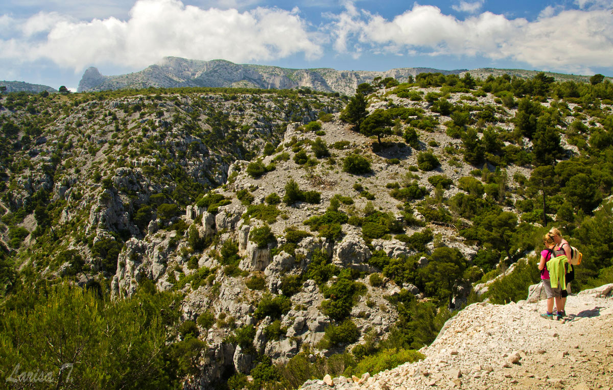 Traseul pe care l-am făcut noi pornește din Cassis, un orășel tare drăguț despre care vă voi povesti altădată, mai exact de lângă parcarea din Port Miou, unde am și lăsat mașina și ține marcajul GR51 urcând odată cu el pe platoul En Vau. Am început prin a coborî în prima calancă -Port Miou– transformată într-un mic port cu bărcuțe numa’ una și una, ca s-o urcăm firește pe partea opusă. Ajunși deasupra calăncii am luat o potecă paralelă cu marea, un pic cam îngustă ce-i drept și cu pietre destul de alunecoase, dar cu o panoramă splendidă asupra albastrului ireal. La momentul respectiv nu apreciam umbra copacilor, dar mai târziu am plâns după ea. Nu după mult timp am început coborârea pe niște cataroaie de toată frumusețea în cea de-a doua calancă –calanca Port-Pin, destul de aglomerată, lumea profitând aici de soare și de apa turcoaz a mării.
