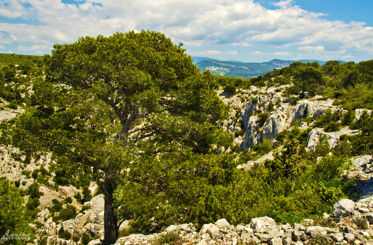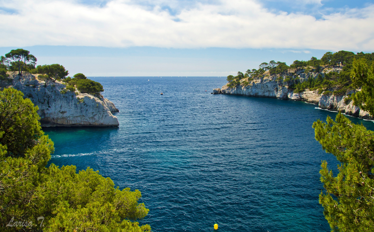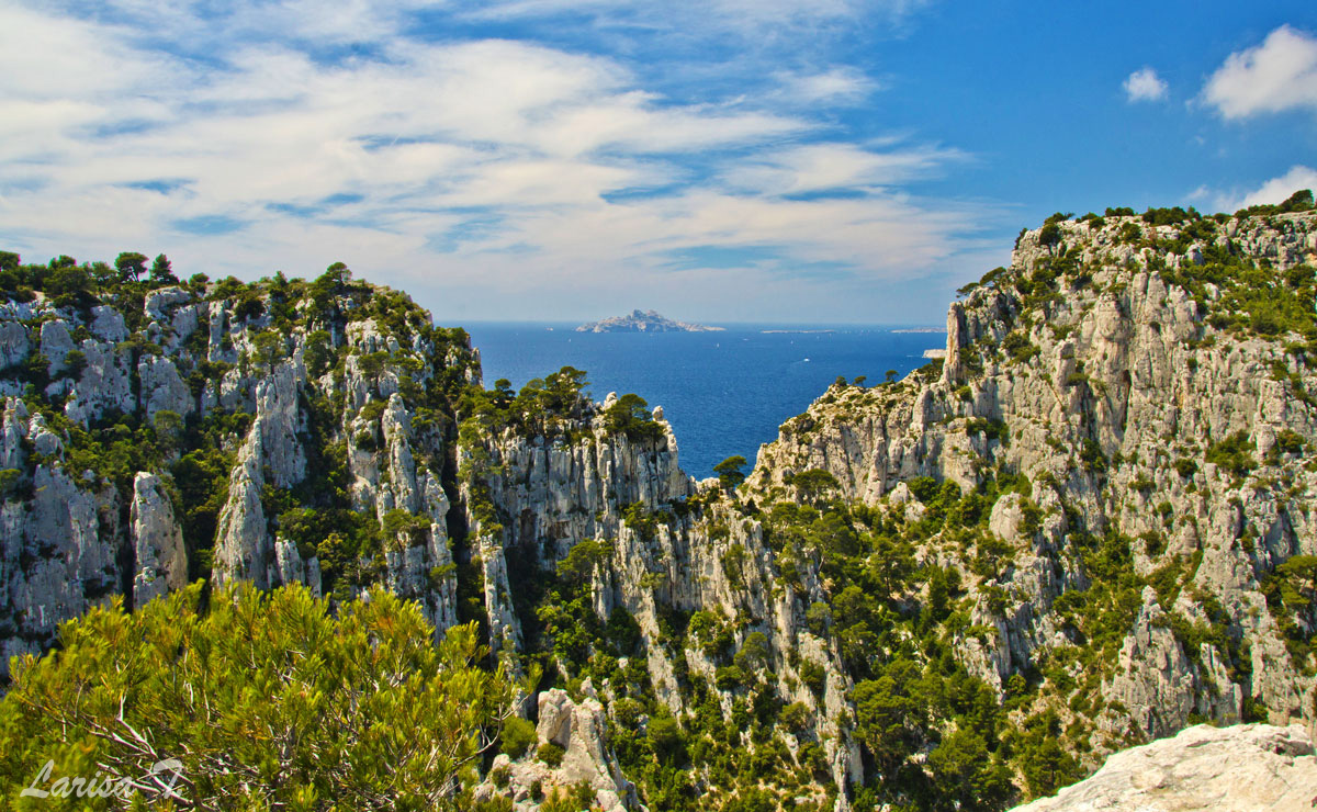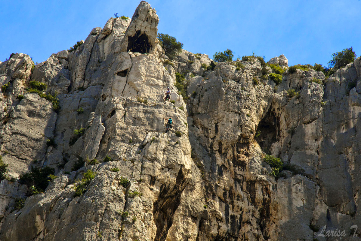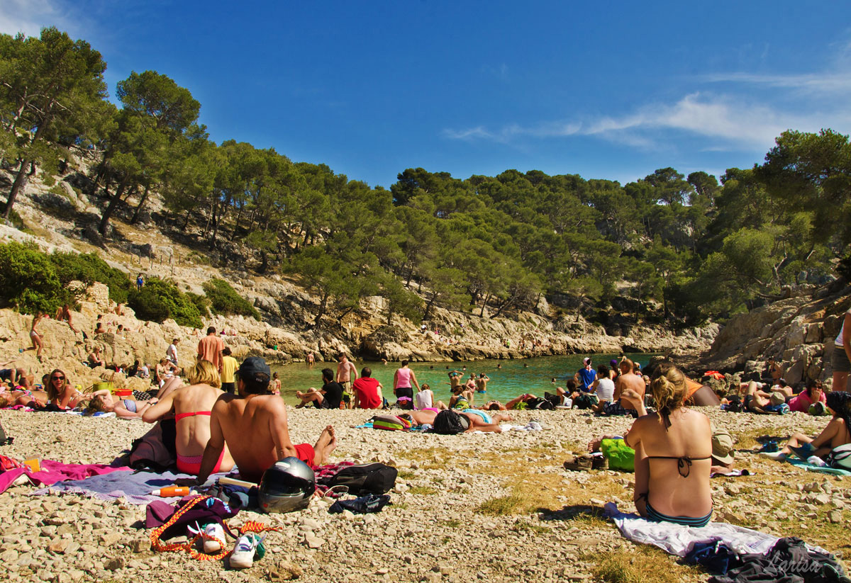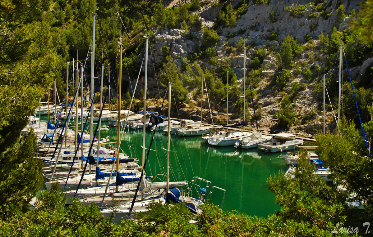 Traseul pe care l-am făcut noi pornește din Cassis, un orășel tare drăguț despre care vă voi povesti altădată, mai exact de lângă parcarea din Port Miou, unde am și lăsat mașina și ține marcajul GR51 urcând odată cu el pe platoul En Vau. Am început prin a coborî în prima calancă -Port Miou– transformată într-un mic port cu bărcuțe numa’ una și una, ca s-o urcăm firește pe partea opusă. Ajunși deasupra calăncii am luat o potecă paralelă cu marea, un pic cam îngustă ce-i drept și cu pietre destul de alunecoase, dar cu o panoramă splendidă asupra albastrului ireal. La momentul respectiv nu apreciam umbra copacilor, dar mai târziu am plâns după ea. Nu după mult timp am început coborârea pe niște cataroaie de toată frumusețea în cea de-a doua calancă –calanca Port-Pin, destul de aglomerată, lumea profitând aici de soare și de apa turcoaz a mării.