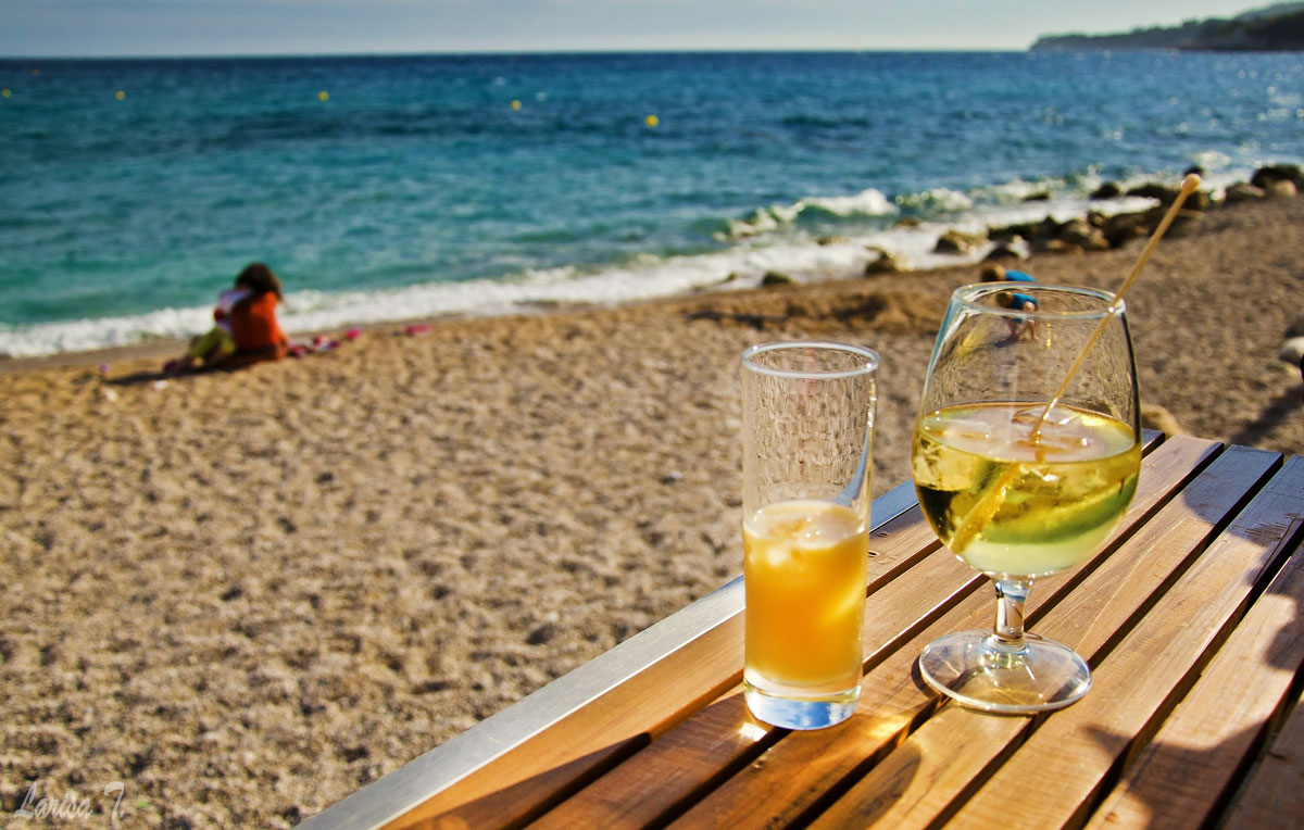 Bun… după ce am rezervat o masă la restaurantul Chez Gilbert pentru ora 19- pentru că v-am mai zis, aici se mănâncă între anumite ore- am pornit să dăm o tură prin port și pe la plajă. Nu ne-am întins la bronzat, că bătea un vânt de te lua pe sus și nici nu mai era la fel de cald afară ca în calănci, dar ne-am așezat la o masă fix pe malul mării pentru a servi apéro-ul: un pastis pentru el, că tot era tradițional în regiune și un kir lejer pentru mine. Foarte plăcut acolo la terasă, a fost ca relaxarea bine-meritată după munte. Am făcut ce-am făcut și mi-am băgat și picioarele în mare, că prea era turcoaz de apetisantă; mi-au degerat instantaneu, dar am răbdat pentru poze. Doar vedeți ce zâmbet am!