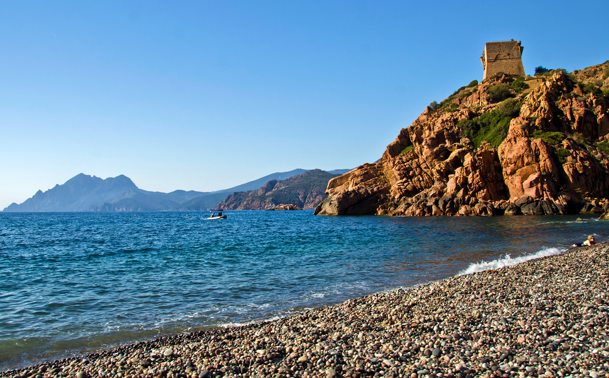 N-am zăbovit prea mult, așa că după câteva ore am luat traseul înapoi, dar nu fără să ne oprim din loc în loc pentru poze. Cu mașina ne-am întors în Porto, fără să trecem însă pe la camping, mergând direct la plaja din sat. Centrul din Porto e tare simpatic: clădiri din același granit roșiatic, rupte parcă din munții ce le înconjoară, strada principală care duce în port, îngustă, în pantă, cu eucalipți, bordată de buticuri, restaurante și terase, plus micul port din Porto plin de ambarcațiuni de toate felurile, majoritatea modeste, destinate turiștilor. Din port o pasarelă duce spre plajă, unde ne-am oprit și noi preț de câteva ore, pentru un pic de bronzat și bălăceală. Plaja Porto nu-i extraordinară, e numa’ pietre, iar apa este destul de adâncă și de tulbure de la mal, însă peisajul cu turnul genovez în dreapta și calanques de Piana în stânga merită câteva ore de chinuială.