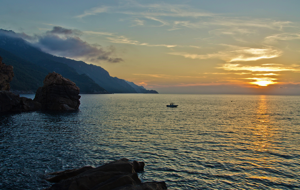 Spre sfârșitul zilei ne-am întors în camping pentru un duș rapid și schimbat, după care am ieșit în oraș să luăm masa. Recunosc, nu prea am mâncat în oraș cât am stat în Corsica. Întrucât ajungeam destul de târziu în camping și destul de obosiți după zile întregi de hoinărit, numai de ieșit nu mai aveam chef. Încropeam ceva rapid, în speță un grătar (campingul punea la dispoziție un grătar mare de piatră, unde fiecare se ducea cu fripturica și cărbunii) și somn de voie, zău că nici acasă nu mă culc așa devreme cum m-am culcat în vacanță! Însă în seara respectivă am hotărât să mâncăm în oraș, nu înainte de a admira apusul de soare peste golf. Se spune că apusul în Porto e cel mai frumos de pe insulă; așa o fi, n-aș avea cu ce să compar. Andrei avea poftă de o langustă, însă cum la mai toate restaurantele langustele trebuiau comandate în prealabil, ne-am mulțumit cu niște pește ordinar la o terasă pe malul mării, plus unul-două-trei pahare de vin, încheind astfel o zi plină. A doua zi aveam s-o luăm de la capăt spre Sagone …