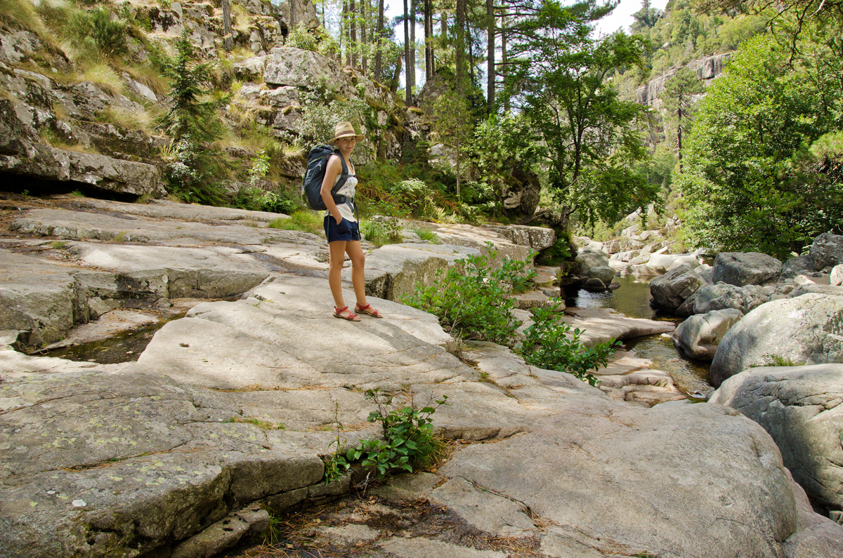 Însă n-a fost rău c-am făcut-o. După ce-am parcat mașina în locul special amenajat, situat un pic mai sus de Evisa, am luat-o la pas pe traseul marcat ce coboară în pădure. N-a durat mult până să ajungem la prima piscină, cam aglomerată ce-i drept, urmând ca de acolo să coborâm o potecă stâncoasă până la următoarele. Destul de în vale ne-am oprit și noi, după ce am găsit un locușor mai retras. Am scos ce aveam de mâncare prin rucsac, punând de un picnic în natură, după care ne-am relaxat la soare pe niște pietroaie, că de bălăceală nici nu încăpea vorba la cât de rece era apa.