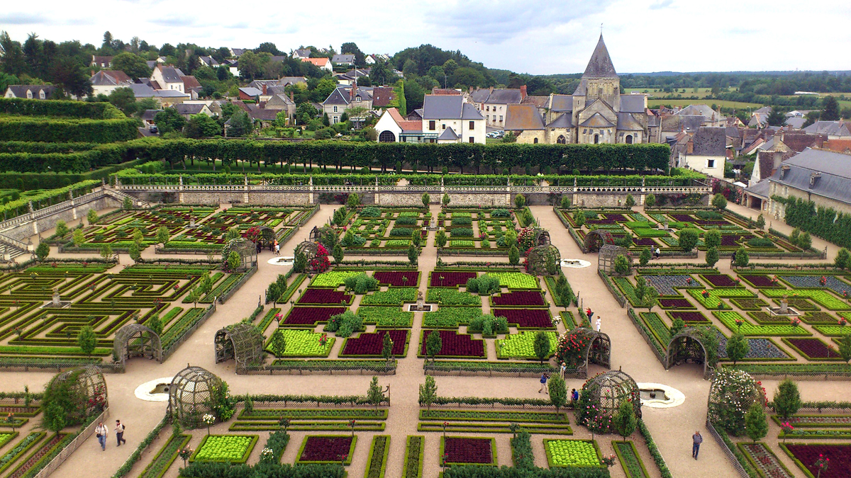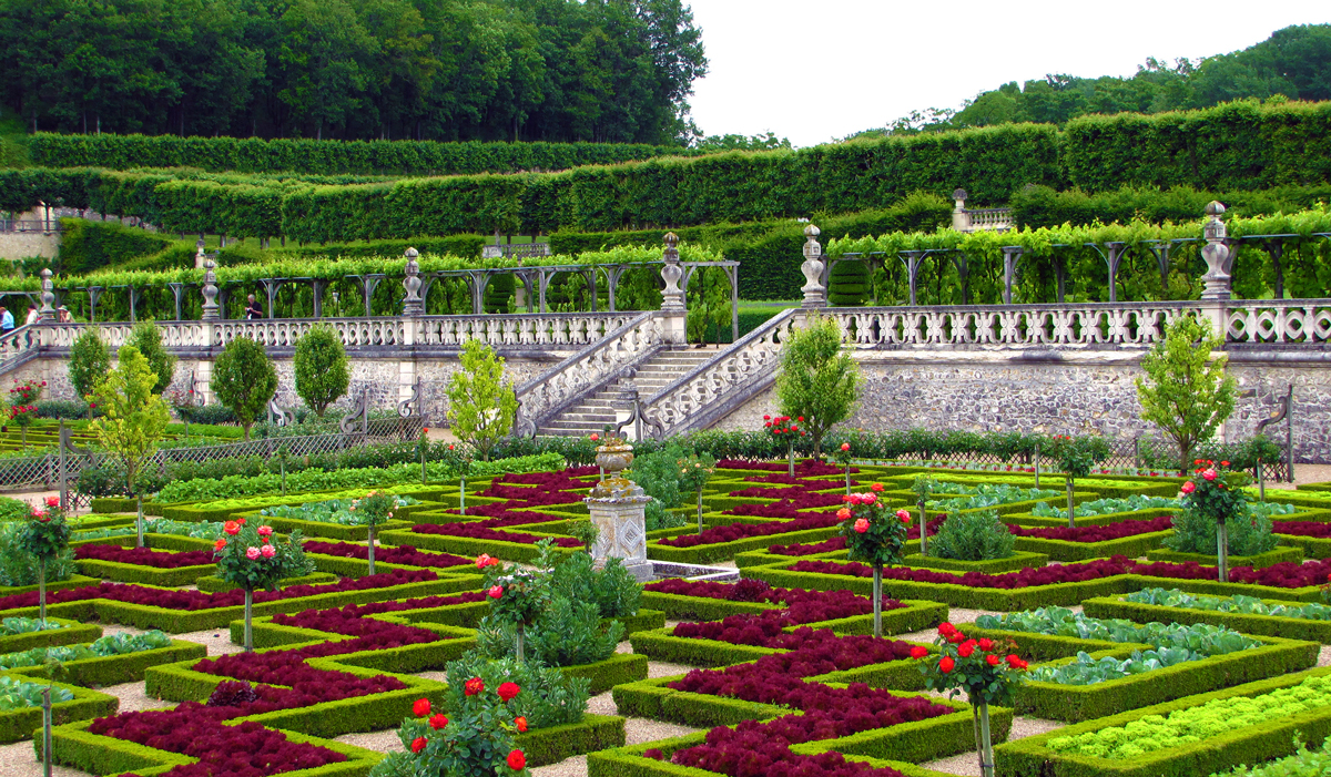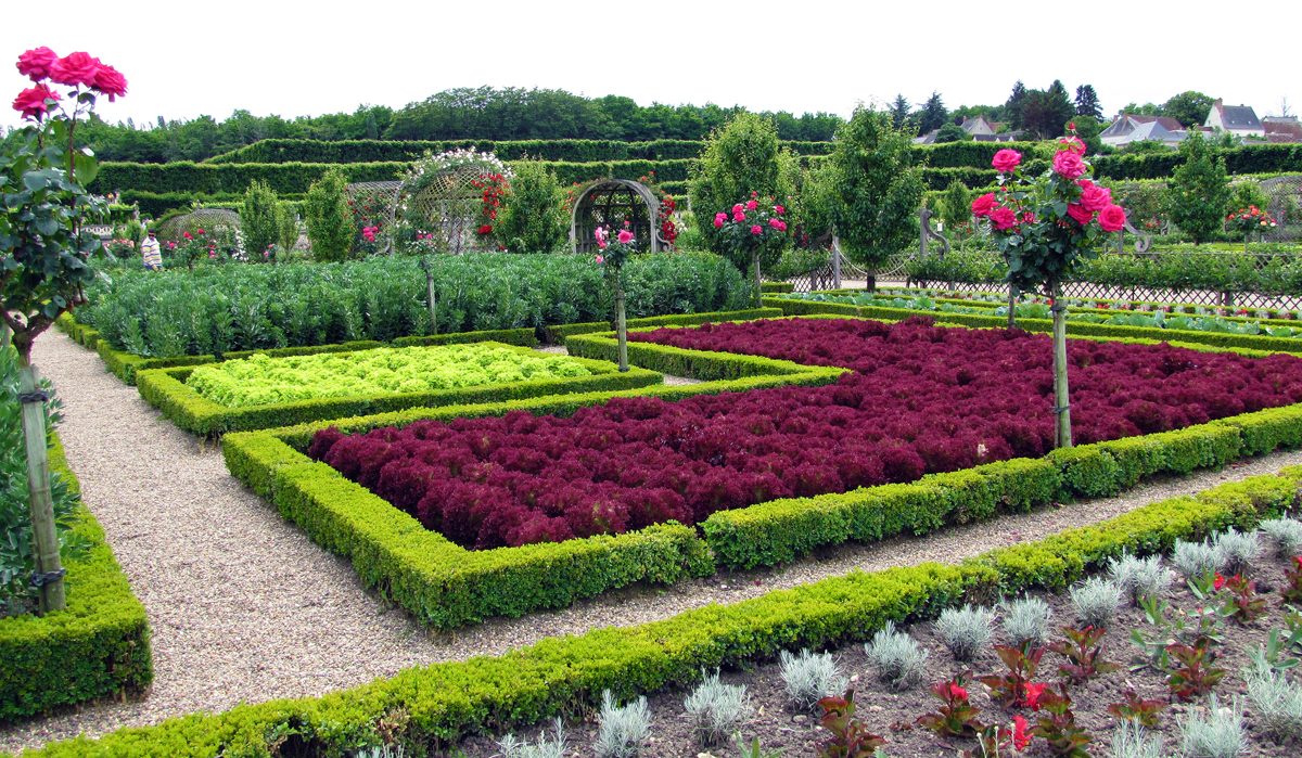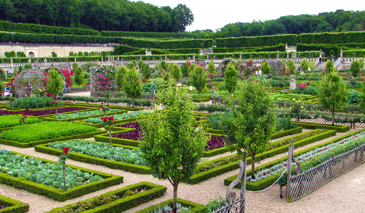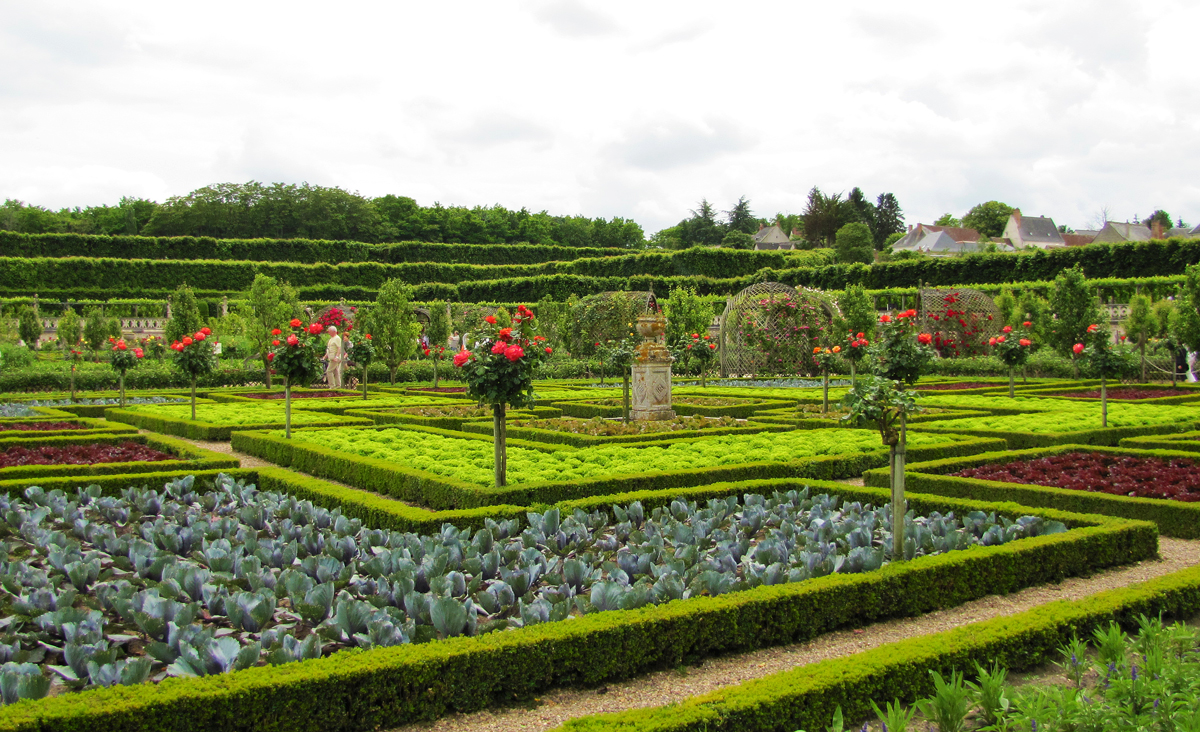 Prima este Grădina de zarzavaturi. Culmea, aceasta este cea mai frumoasă, deși n-ai crede că o grădină de zarzavat poate fi așa. Grădina, organizată în stil renascentist, se compune din 9 pătrate identice, dar cu motive geometrice diferite. În pătrate se cultivă legume și zarzavaturi, în culori alternante, special pentru a da impresia unei table de șah multicolore. Originea grădini  datează din Evul Mediu, când  călugării vechilor abații își cultivau legumele respectând forme geometrice, în special forma de cruce. Apoi vine influența italiană, care adaugă grădinii elemente decorative cum ar fi fântânile, florile colorate și arbuștii ornamentali. Și uite așa grădinarii francezi reunind cele două influențe, au demonstrat că trandafirii și varza pot „conviețui” foarte bine împreună, și mai mult decât atât, pot chiar aduce și o desfătare ochiului. Așa a apărut grădina de zarzavat decorativă.
