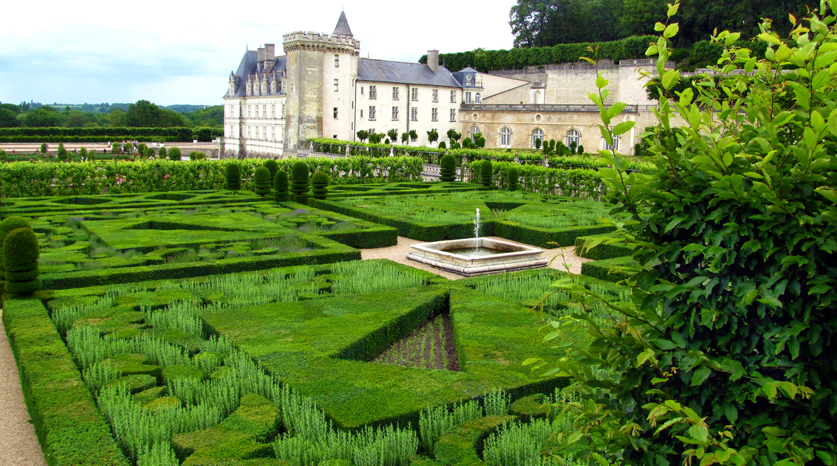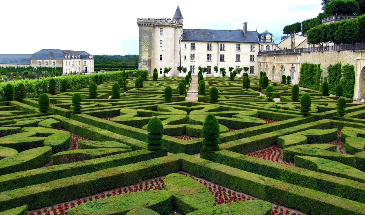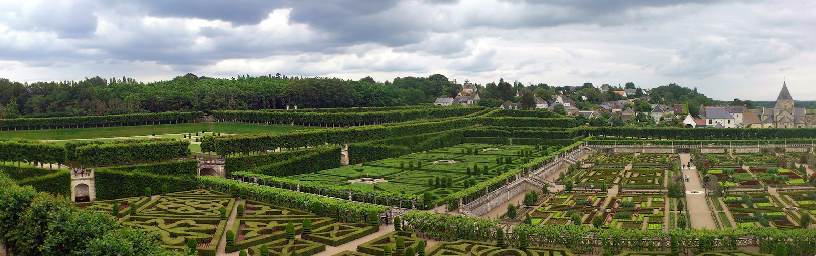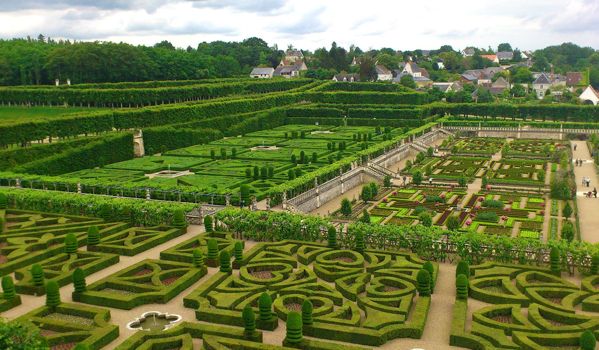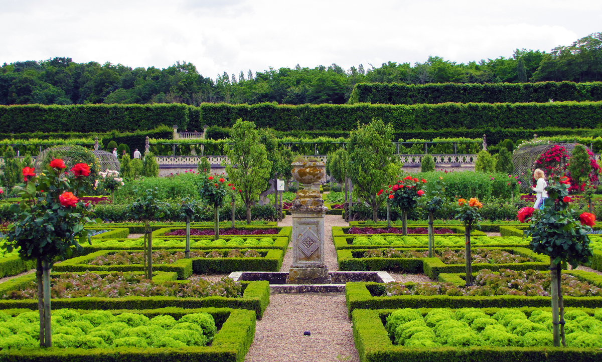 Prima este Grădina de zarzavaturi. Culmea, aceasta este cea mai frumoasă, deși n-ai crede că o grădină de zarzavat poate fi așa. Grădina, organizată în stil renascentist, se compune din 9 pătrate identice, dar cu motive geometrice diferite. În pătrate se cultivă legume și zarzavaturi, în culori alternante, special pentru a da impresia unei table de șah multicolore. Originea grădini  datează din Evul Mediu, când  călugării vechilor abații își cultivau legumele respectând forme geometrice, în special forma de cruce. Apoi vine influența italiană, care adaugă grădinii elemente decorative cum ar fi fântânile, florile colorate și arbuștii ornamentali. Și uite așa grădinarii francezi reunind cele două influențe, au demonstrat că trandafirii și varza pot „conviețui” foarte bine împreună, și mai mult decât atât, pot chiar aduce și o desfătare ochiului. Așa a apărut grădina de zarzavat decorativă.