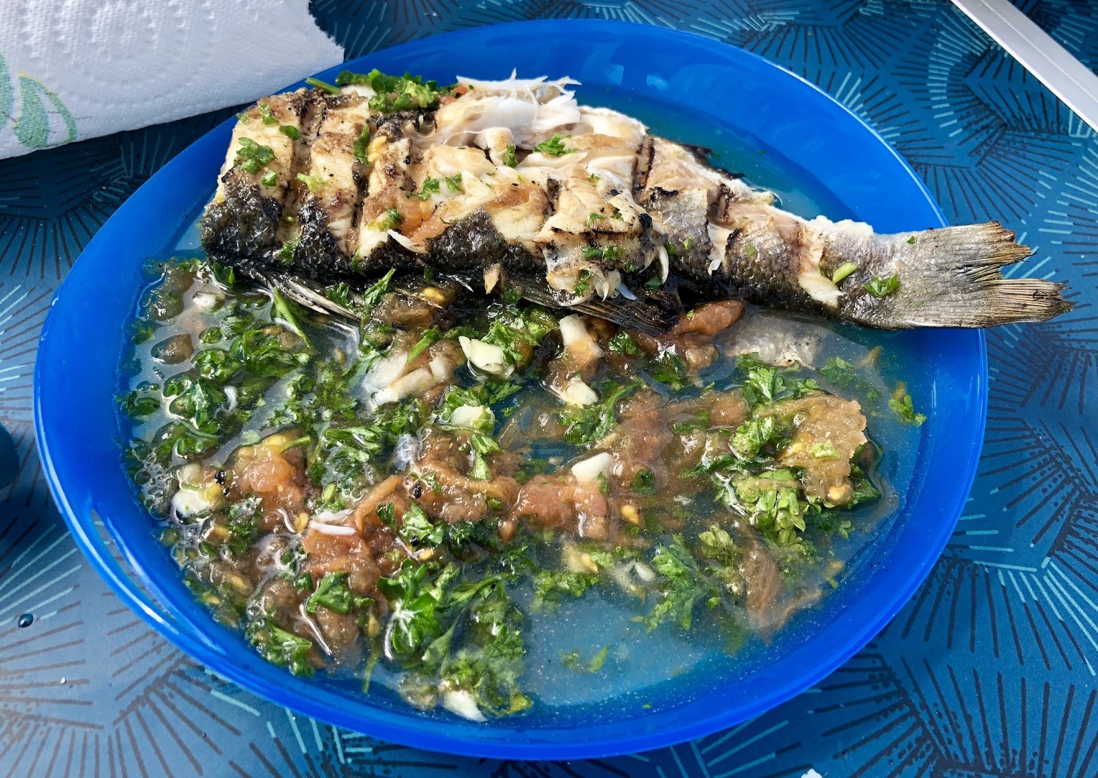 Saramura noi o facem simplu, cu cateva roșii coapte pe grătar și curățate de pielița, pătrunjel proaspăt din belșugul, sare, piper și niște apa călduță. Amestecam totul, adăugăm și pestele fript și gata, lăsam sa se răcească și sa-și lase gustul. Înainte puneam și un pic de ardei iute, acum am renunțat pentru a putea mânca toți trei. Am făcut-o cu bar proaspăt de la pescarie, aruncatul undiței a fost mai mult de placere ca nu a tras nimic la ea 😂