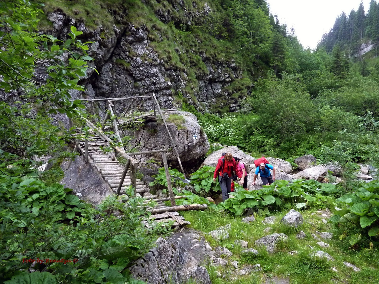 De la cabana continuam pe vale in sus, prin padure si curand intram in Cheile Zanoagei Mari, adanca despicătura de o salbatica maretie între abrupturile din calcare ale Munţilor Zănoaga şi Dichiu. Poteca se strecoară în urcuş continuu prin molidiş, printre stâncării, bolovănişuri, printre buruienişuri şi tufărişuri. Incepe iarasi si ploaia.