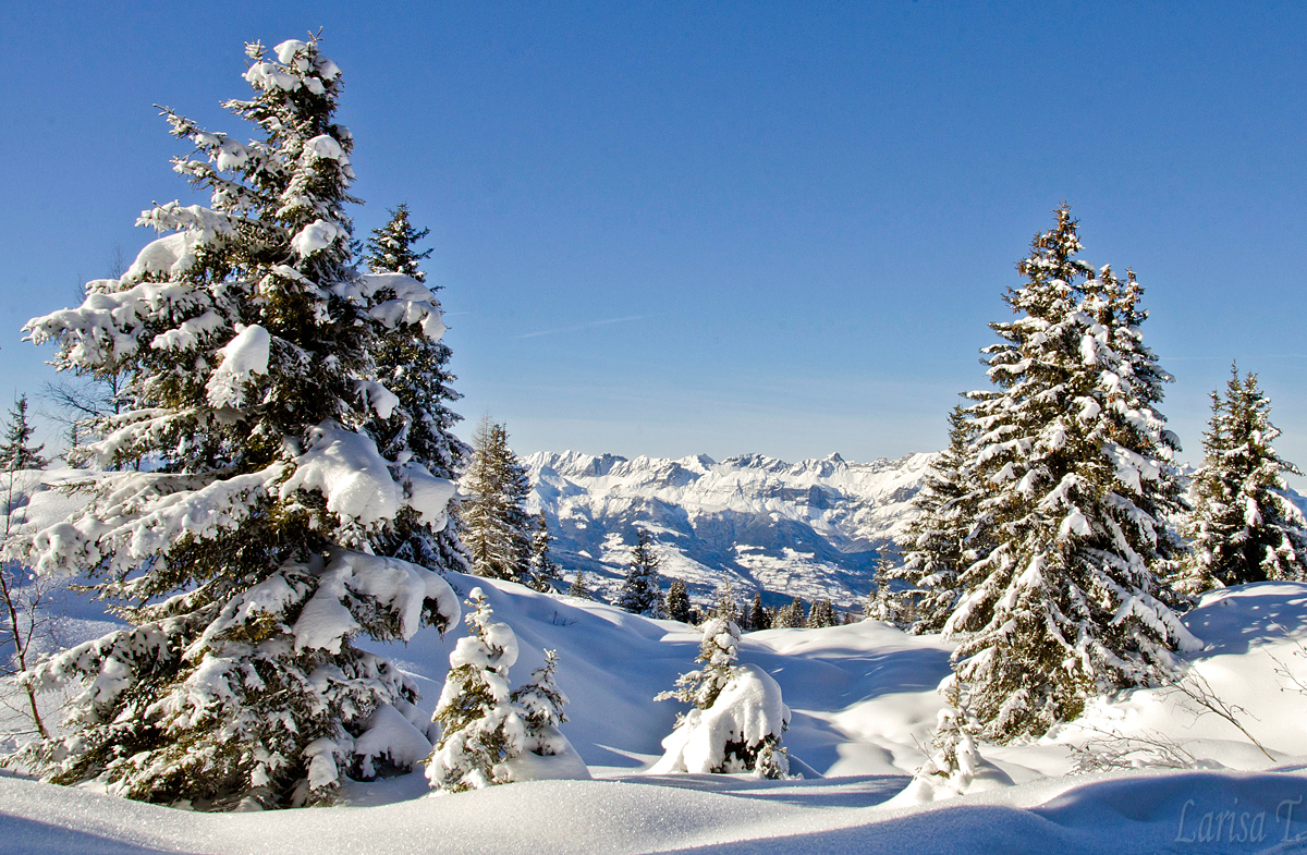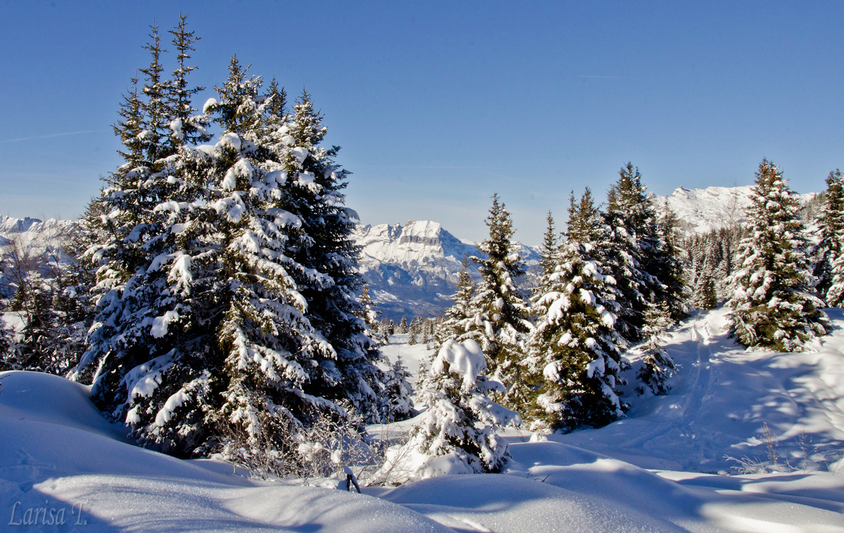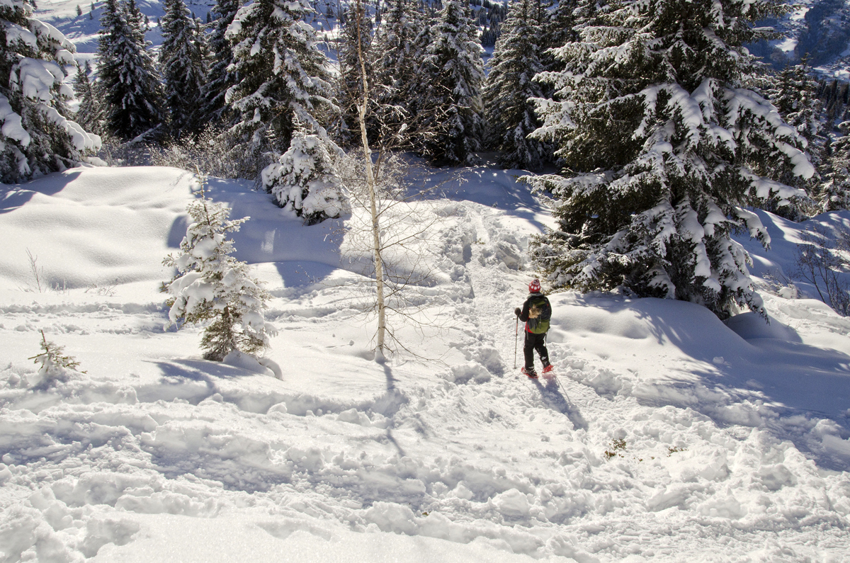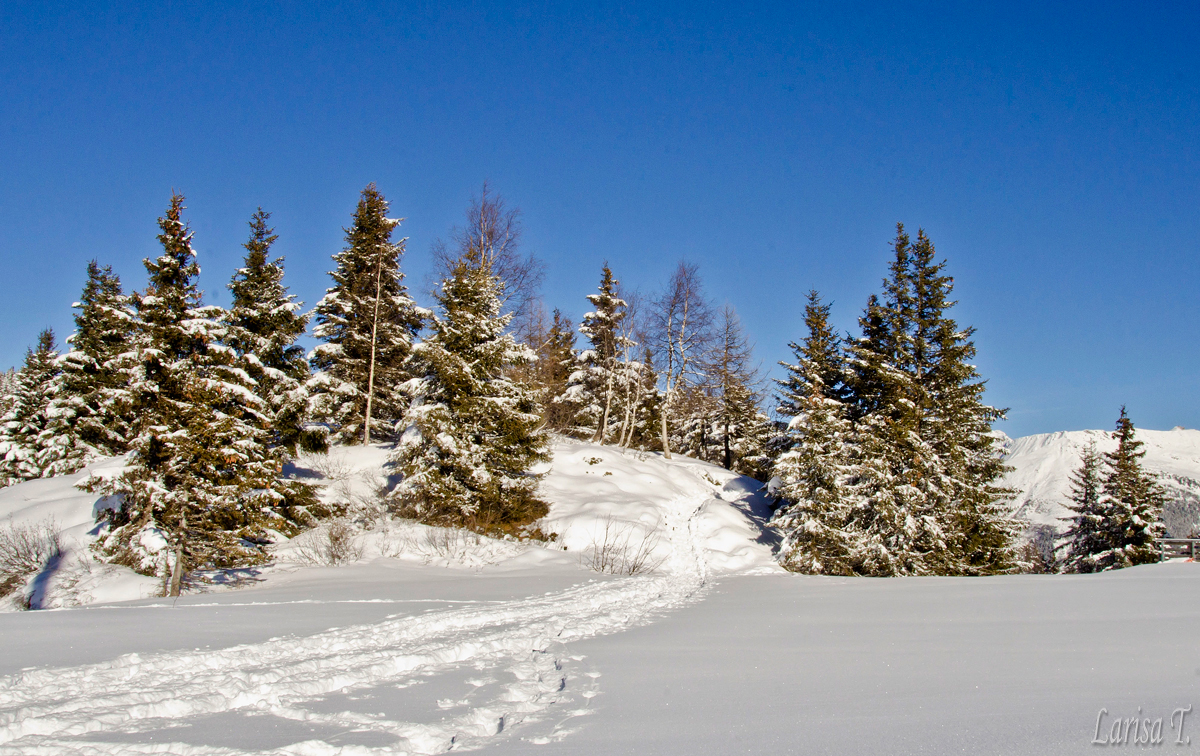 Poteca e foarte lejeră, cred că se poate face și fără rachete de zăpadă, doar în bocanci, diferențele de nivel nu-s mari, iar timpul se rezumă undeva la 2-3 ore pentru întreaga buclă; sunt câteva zone mai sensibile când zăpada este abundentă, dar cu grijă se pot traversa fără probleme. Am mers mai mult printr-un pâlc de pădure de brazi, care brazi erau la fel de cocoșați ca cei din ziua precedentă. Zăpada era moale, proaspăt căzută și absolut nici un nor nu se întrevedea pe cer. De-a lungul potecii, copacii deschideau luminișuri de unde puteam admira un peisaj de-a dreptul magnific. Ce peisaj… Doamne… Or fi ei Alpii aglomerați și or fi piedut mult din sălbăticie, dar unele priveliști sunt de-a drepul halucinante. Îți taie răsuflarea nu alta, sau cel puțin mie mi-au tăiat-o, pentru că v-am mai spus, nimic din ce există în lumea asta, oraș, sat, castel, monument, nu m-ar ptea vreodată impresiona, așa cum o face natura prin creațiile sale.