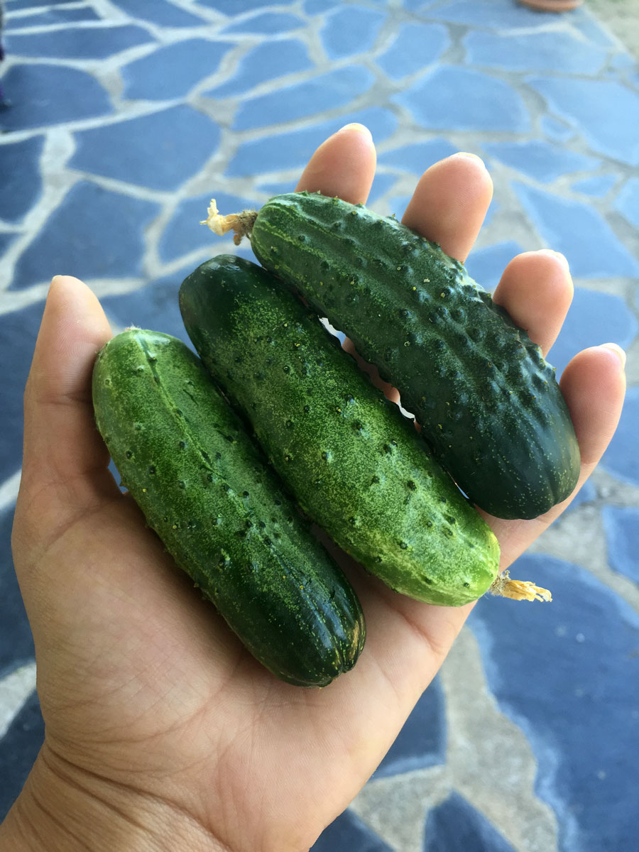 La fel și cu castraveții… Nu știu dacă v-am povestit vreodată, dar aici în Franța nu se găsesc castraveți mici (cornichon), decât murați, verde doar castravete din ăla mare și lung (concombre). Am avut niște semințe din România, aduse de mama, mai multe soiuri pe care le-am amestecat într-o micuță cultură. Au ieșit, i-am rărit, le-am pus araci, i-am udat și ne-au dat atâția castraveți de am mâncat toată vara atât cruzi în salată, dar mai ales murați în saramură. Miam-miam, uitasem gustul!